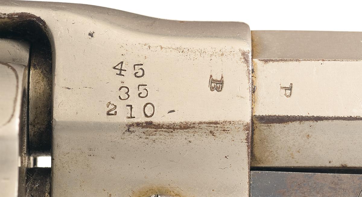 The revolver is equipped with a dovetail target style front sight and a fixed rear sight screwed to the top strap. It has a Whitney-style 3 piece rammer with latch and a Whitney-style hammer locking screw. The 6-shot cylinder is fluted with deep flared nipple recesses and Remington-style star wheel at the rear. It has a thick flat sided hammer with knurled short spur and an unique coil hammer spring. Serial number is stamped on the left side of the frame, barrel, loading lever, locking pin and butt. Interestingly, both sides of the barrel, the back of recoil shield, trigger guard and both sides of the barrel lug are stamp with "B" inspector initials. The right side of the frame is also stamped "45 / 35 / 210" (this is possible referring to the bullet size, powder charge and bullet weight). Nickel with casehardened rammer. Fitted with smooth two piece grips.