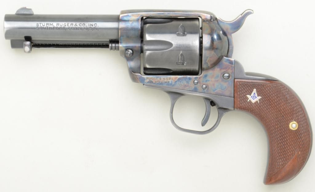 Custom Ruger Backhawk SAA revolver with bird’s head style grip, .44 Special cal., 4” barrel, blue and case hardened finish, checkered wood custom grips with Mason’s organization emblem inlet at top of leftgrip, #30-64706. This gun is in overall fine showing the majority of its custom blue and case hardened finish, crisp action, sharp markings, very good bore, fine custom grips; front sight has been modified for pointshooting; backstrap is inscribed “D.C. McDuffie”; a great piece for the End of Trails or SASS event. Est.: $500-$1,000.