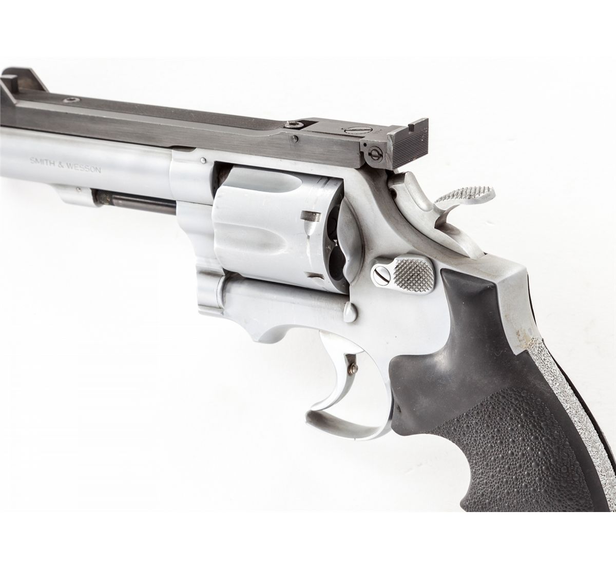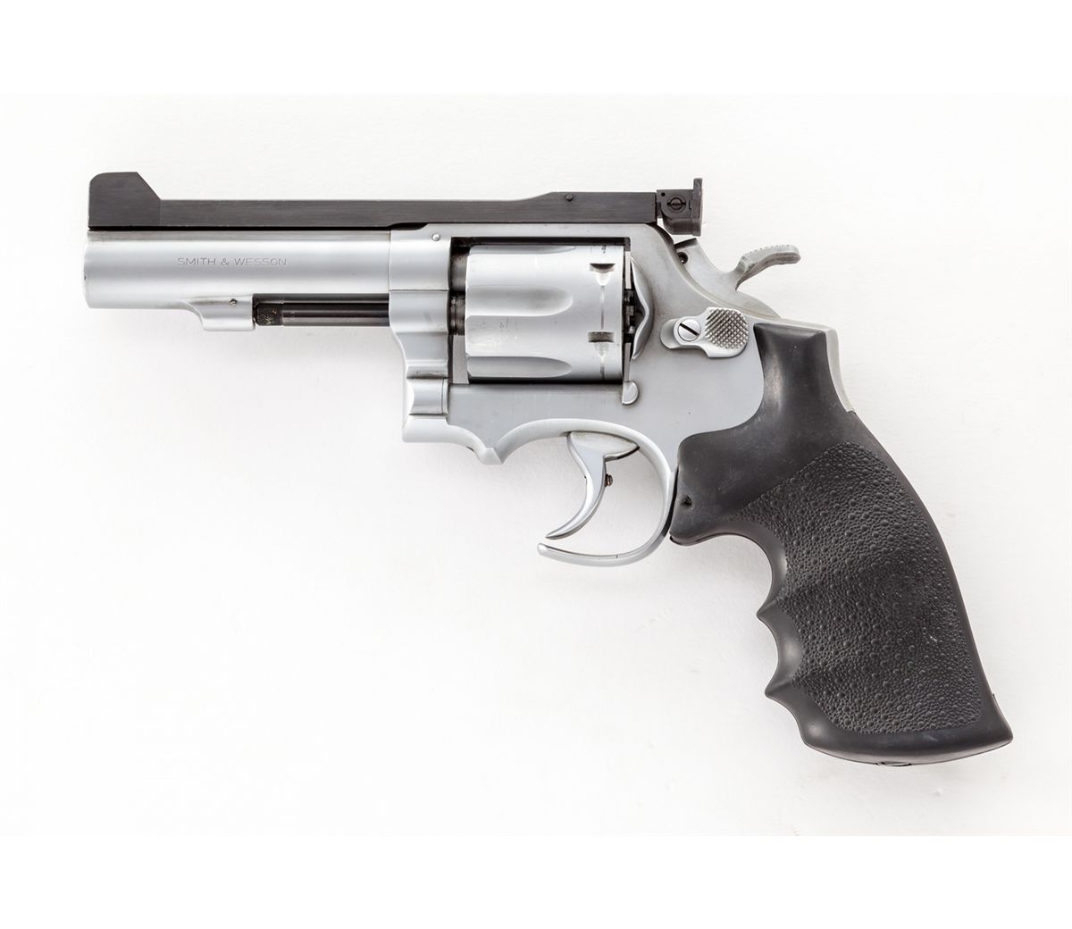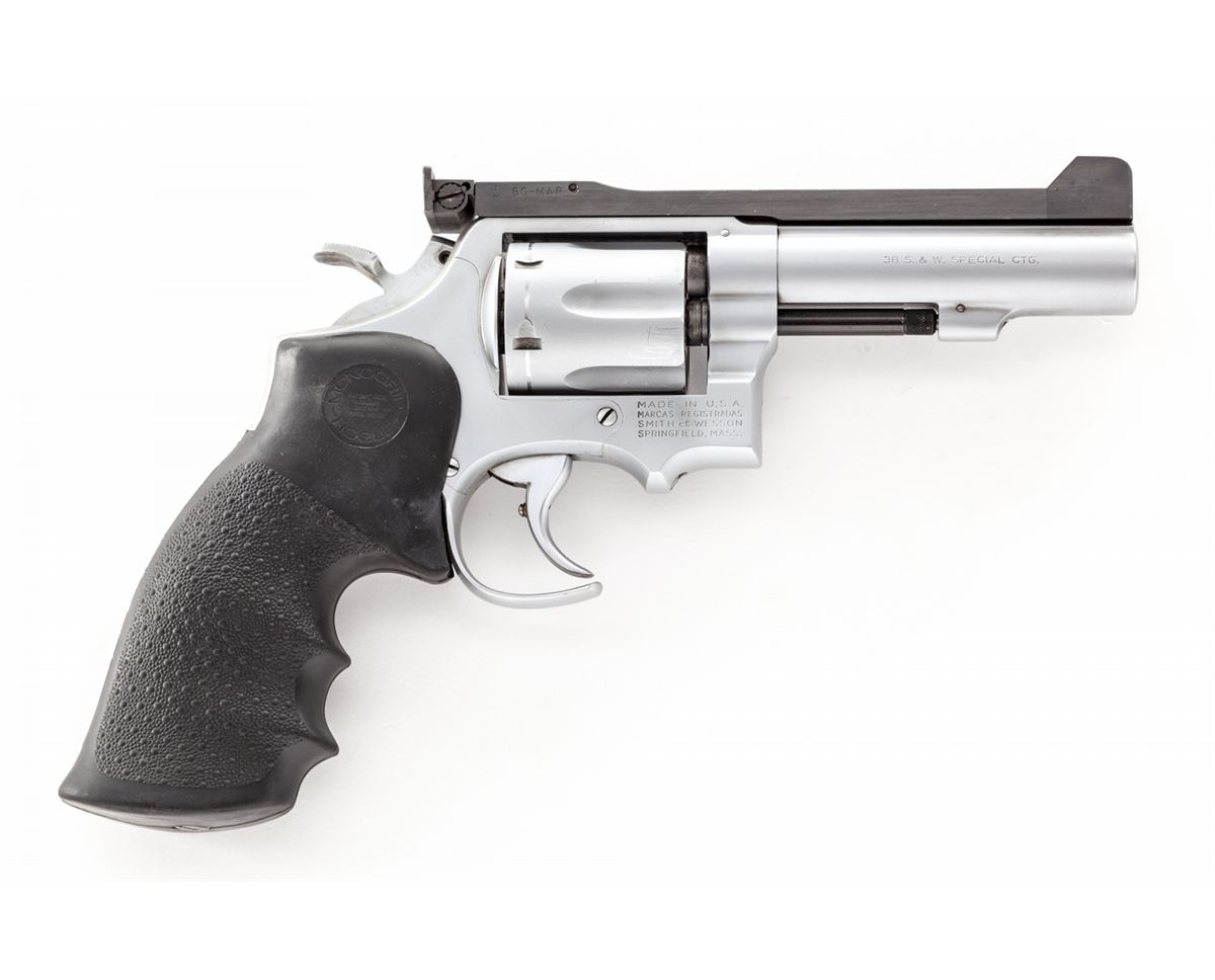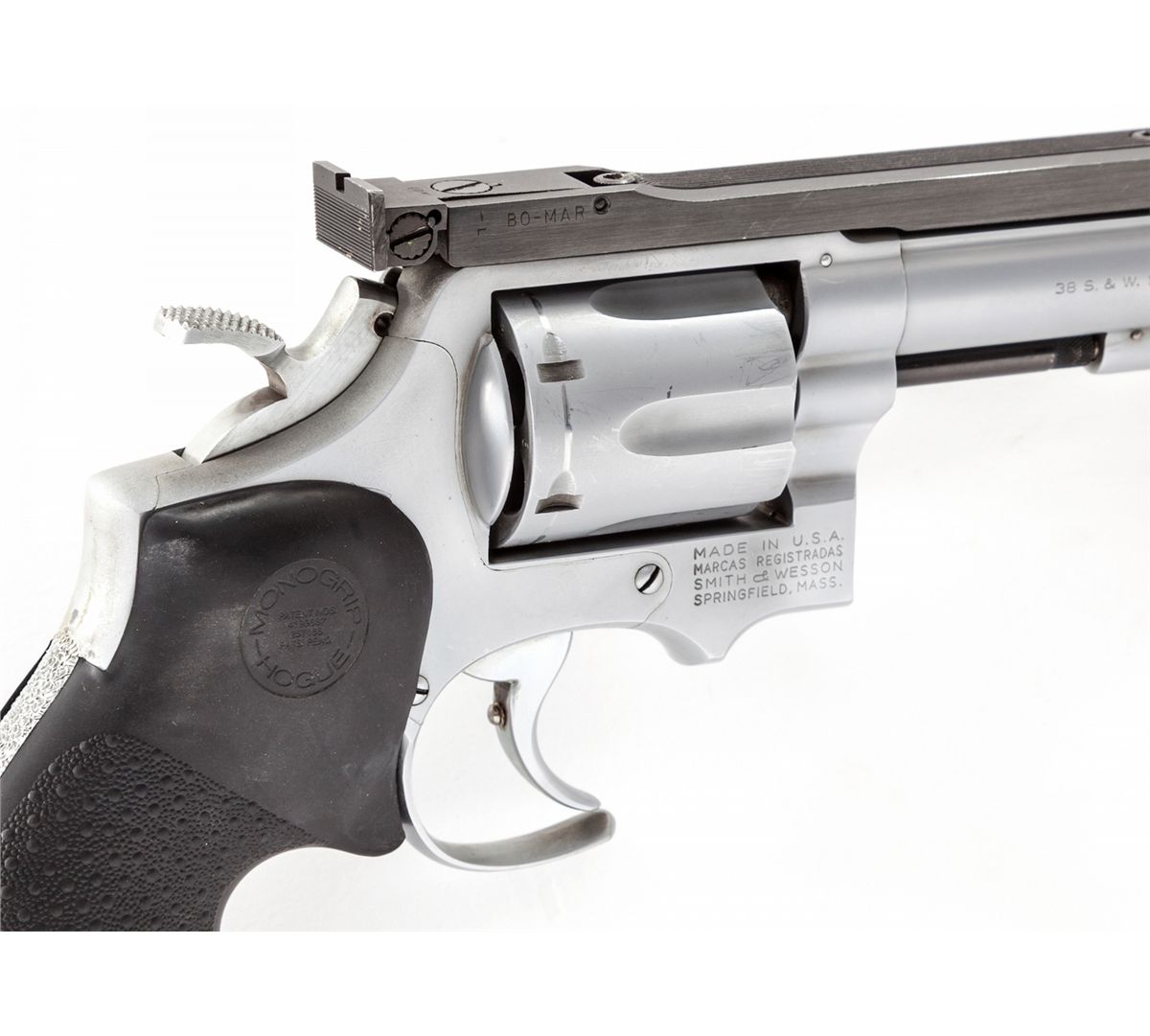 Custom Smith & Wesson Model 10-3 Double Action Revolver, #C571571, .38 Spec. cal., 4'' barrel, hard chrome finish, Hogue rubber grips, with Bomar rib, cutaway triggerguard, and tuned action. Condition is fine showing some range use. Est.: $500-$750. (Modern)