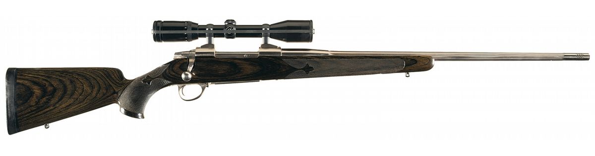 Has a fluted stainless barrel with muzzle brake. The top of the receiver has an integral scope base with a Zeiss Diavari-C 3-9x36 scope mounted. The laminated hardwood stock has Fluer-de-Lis pattern checkering, sling studs, a right hand palm swell, a raised cheekpiece and a Pachmayr Decelerator recoil pad. With lens covers for the scope.