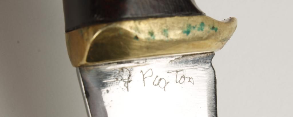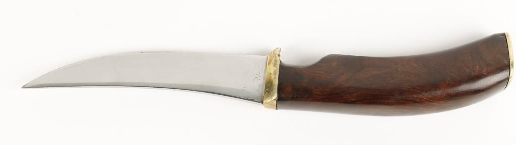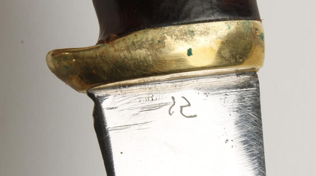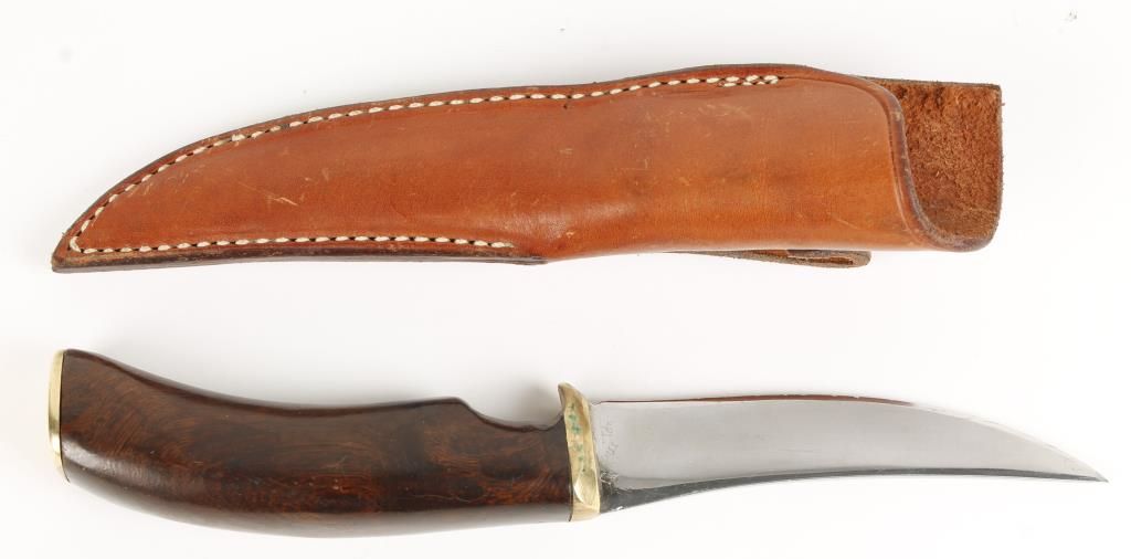 Well marked polished 4 3/4" blade, wood handle with brass furniture, overall 9 1/2", nice custom scabbard by Madison Saddlery out of Montana.