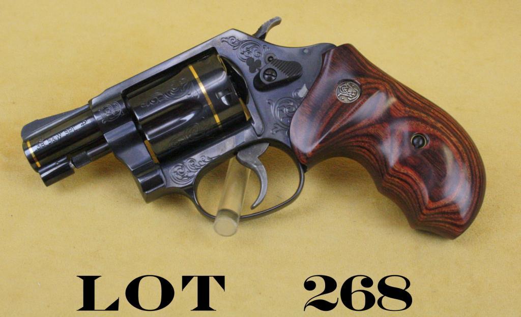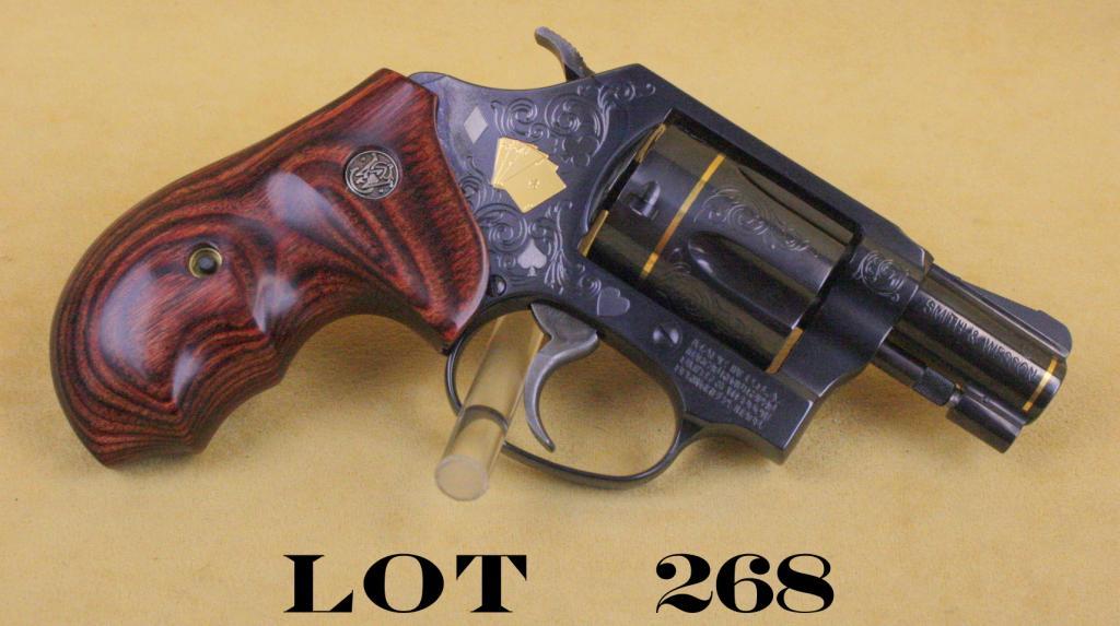 Custom Smith & Wesson Model 36-10 DA revolver, barrel marked .38 S&W SPL +P caliber, 2” barrel, engraved with gold banding on the cylinder and muzzle of barrel with gold accented “Aces and Eights” cardhand on right side of frame, blue finish, custom finger groove medallion wood grips, #TEX1524. This gun is in overall excellent condition showing approx. 99% original finish, fine bore, action, markings andgrips; accompanied by a factory blue hard plastic carry case with end label serial numbered to this gun. Est.: $500-$750.