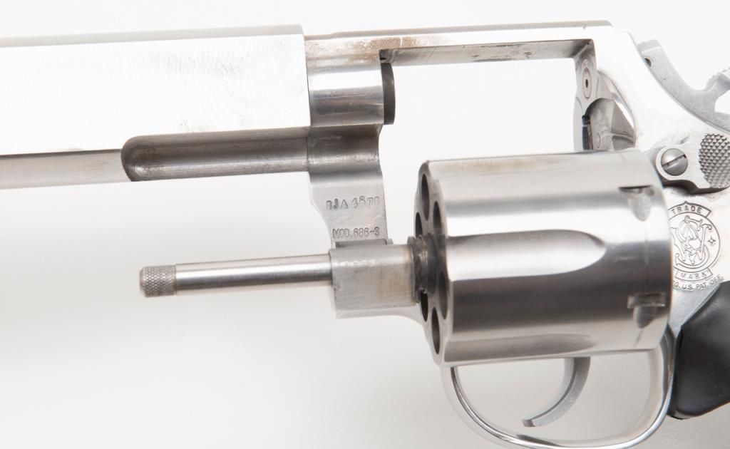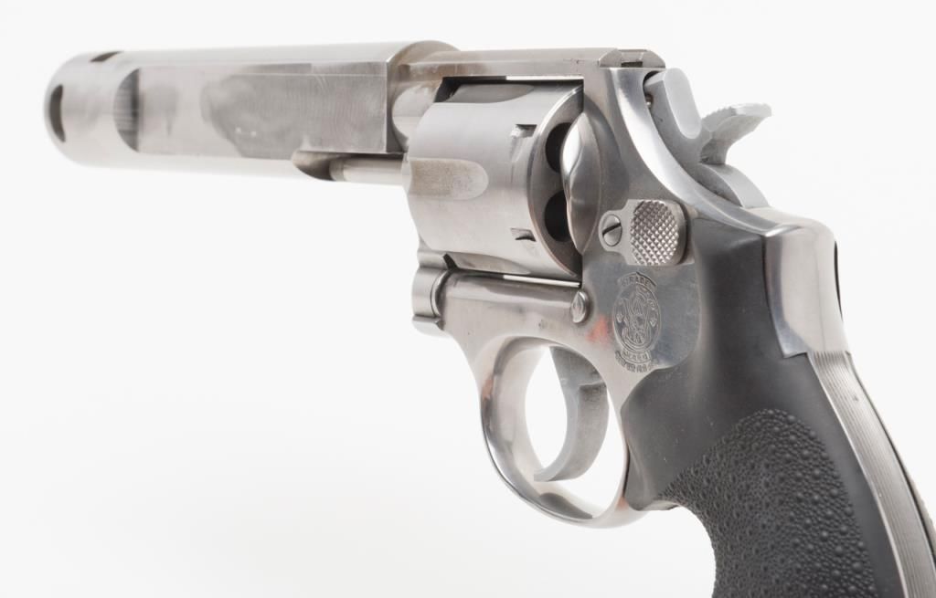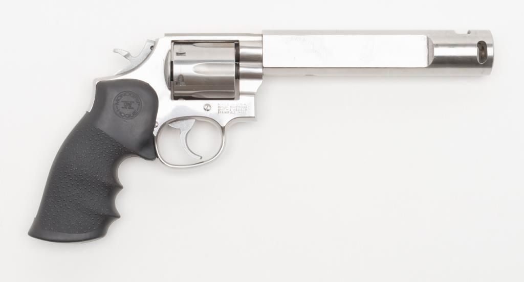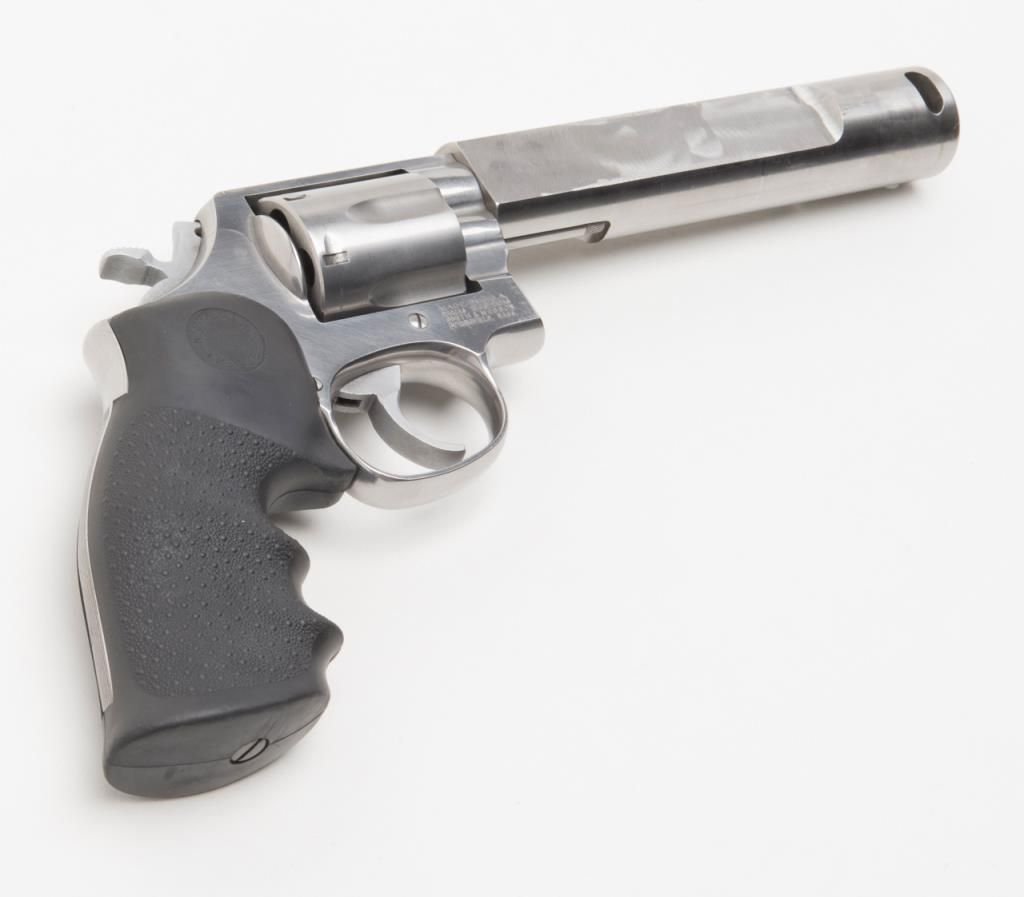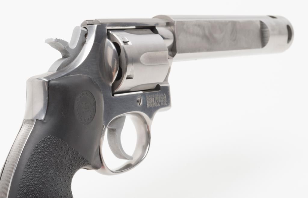 Custom Smith and Wesson Model 686 revolver, .357 Magnum caliber, Serial #BJA4676. The pistol is in overall very good condition with a custom 6 ¾” bull barrel. The pistol retains nearly all of its stainless finish with some discoloration on theframe, near the forcing cone. The barrel has been replaced with a flat sided, compensated bull barrel that shows significant polishing on both sides. The front and rear sights have been removed and the action tuned. The Hogue rubbergrips are in very good condition and the bore, action and markings are all very good. (Modern/PPT). Est.: $300-$600.