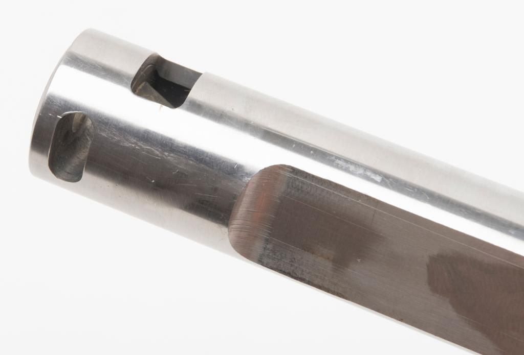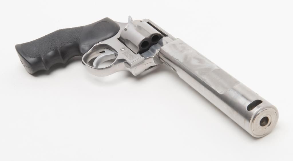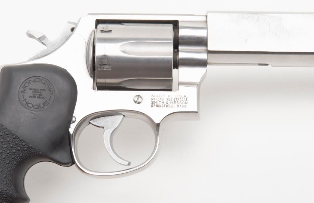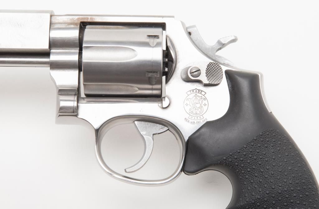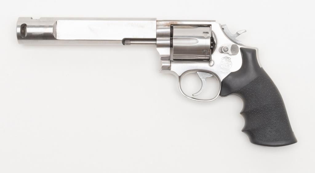 Custom Smith and Wesson Model 686 revolver, .357 Magnum caliber, Serial #BJA4676. The pistol is in overall very good condition with a custom 6 ¾” bull barrel. The pistol retains nearly all of its stainless finish with some discoloration on theframe, near the forcing cone. The barrel has been replaced with a flat sided, compensated bull barrel that shows significant polishing on both sides. The front and rear sights have been removed and the action tuned. The Hogue rubbergrips are in very good condition and the bore, action and markings are all very good. (Modern/PPT). Est.: $300-$600.