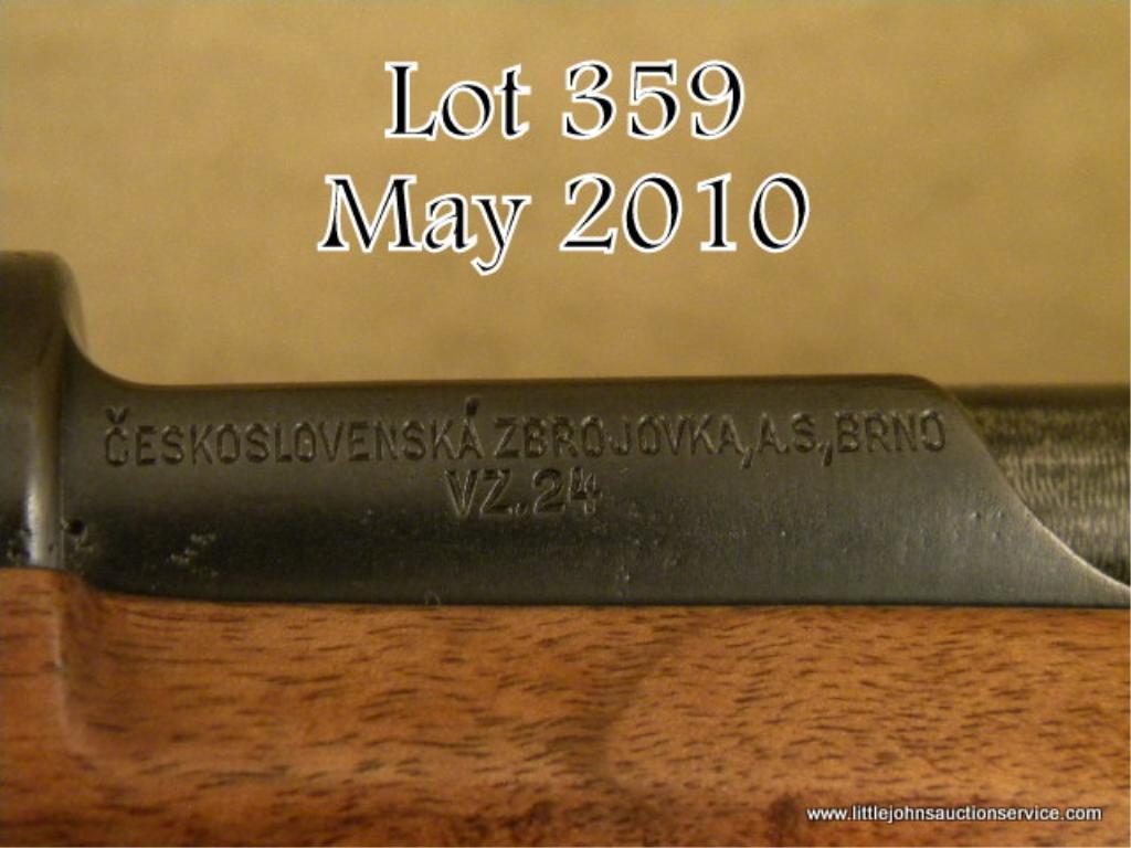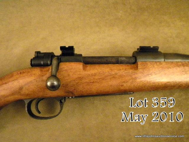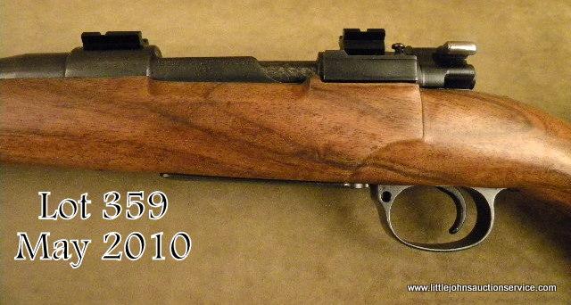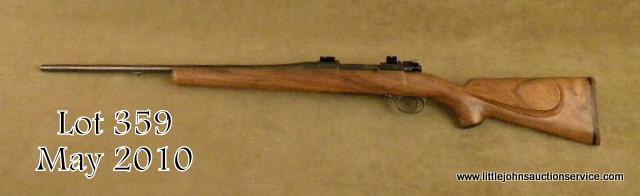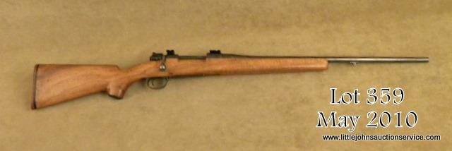 Custom Sporterized CZ bolt-action rifle, .257 Roberts cal., 24” round barrel, blue finish, custom blonde colored wood stock with semi-pistol grip and red Pachmayr butt pad, #P58894. This gun is in overall very good condition showing approx.95% old refinish to metal surfaces and scope mounts on top of receiver; very good to excellent bore, crisp action, very good markings and very good wood stock. A quality sporting rifle in a desirable caliber. Est.: $250-$500.