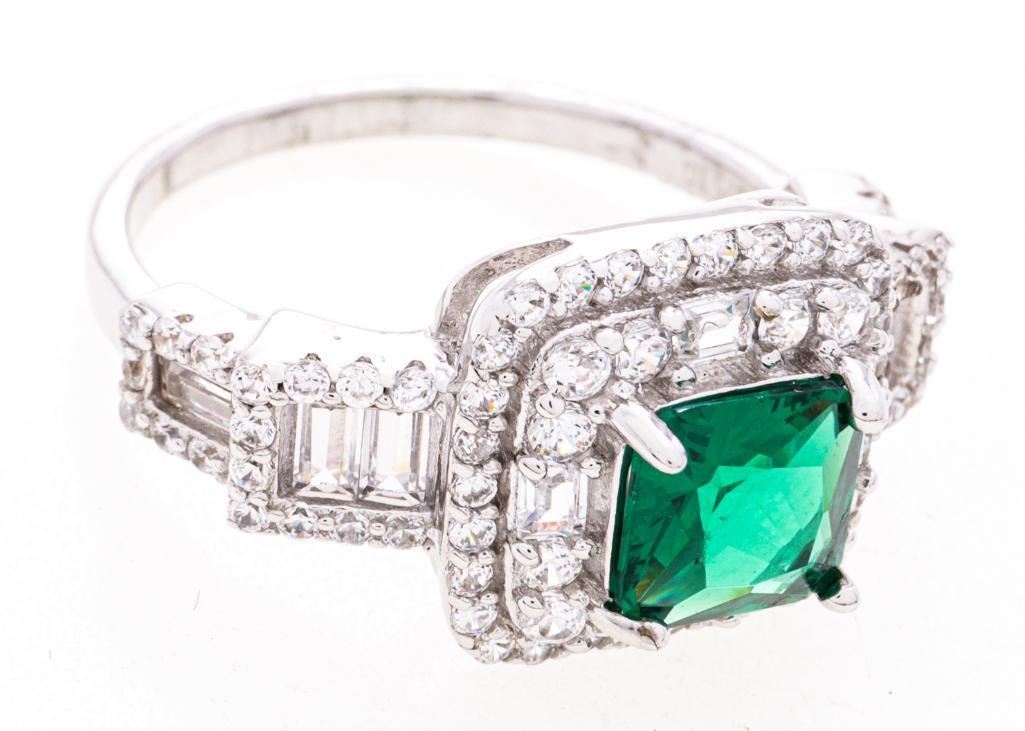 Custom Sterling Silver Ring, Size 8, Square Cut Emerald Green Swaorovski Elements w/ Baguettes, Set