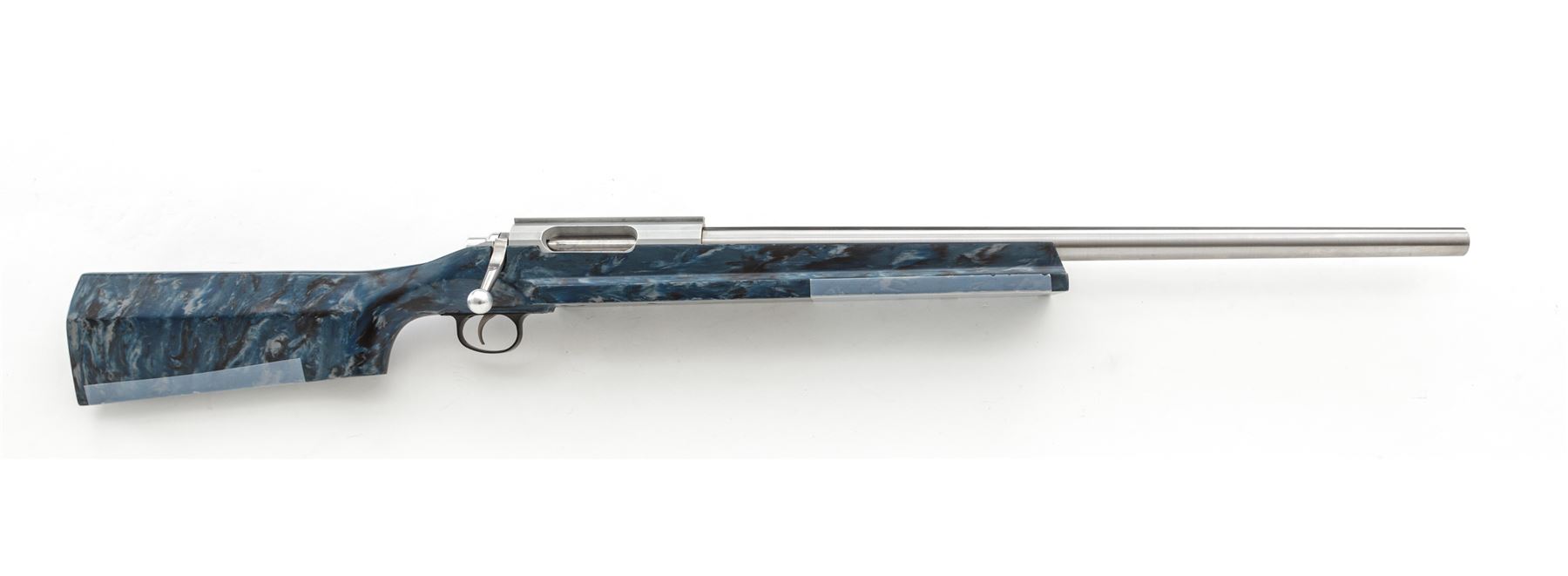 Custom Stolle Panda Action Single Shot Bolt Action Benchrest Rifle, #93198, 6mm PPC caliber.  24'' stainless heavy barrel marked on the left side near the receiver ''6 PPC .262 NK'', aluminum Stolle Right bolt, right port Panda action with integral dovetailed base measures 8.5'' overall; left side marked ''-STOLLE-PANDA-/93198''; no safety.  Blue/white/black fiberglass benchrest stock with a 3'' wide flat forend; buttstock with an approx. half-inch hollow cavity that is filled with a threaded brass plug, with adjustable trigger.  Other than the barrel, everything on this rifle is built light including the aluminum bolt shroud, stock hardware, and black composite triggerguard. In fine overall condition, this rifle shows typical evidence of moderate range use.  Metal surfaces with intermittent light scuffs and handling marks, factory lettering is clear.  Stock with a semi-transparent protective film on the lower edge of the forend and buttstock; stock also shows signs of normal range marks with a few more noticeable but still small dents to the right of the triggerguard.  Rear triggerguard screw is missing.  Action functions properly with a smooth and light trigger pull; bore is clean with excellent rifling.  Est.:  $1,000-$1,500. (Modern)