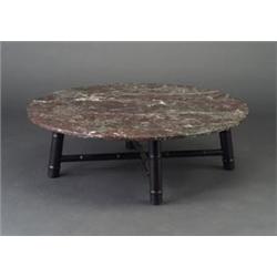 Custom T.H. ROBSJOHN-GIBBINGS circular red, brown and white figural marble-topped coffee table, c. 1950, with black faux bamboo base. Marked Made in Italy. 15 1/2" x 48" dia. $1,700 - 2,400