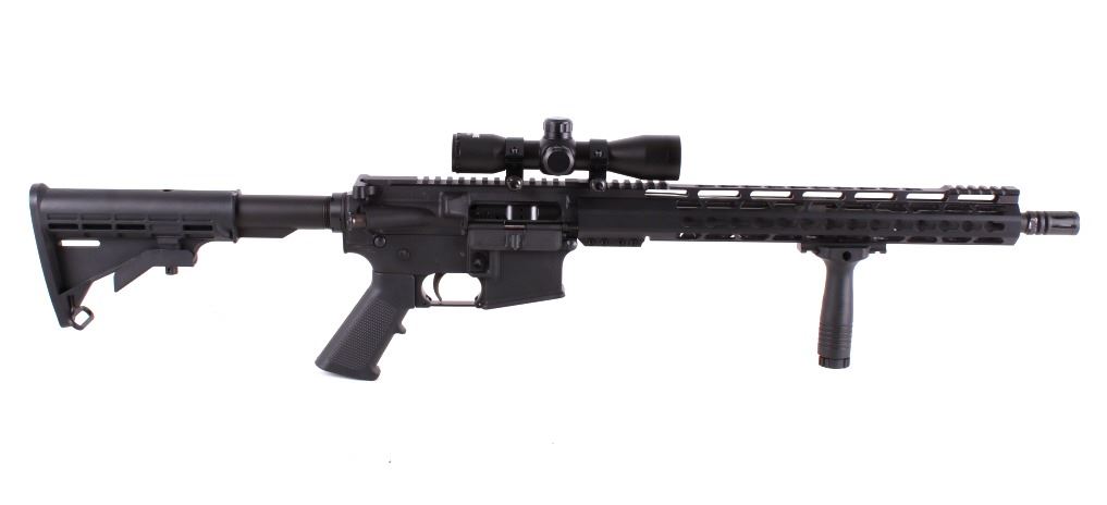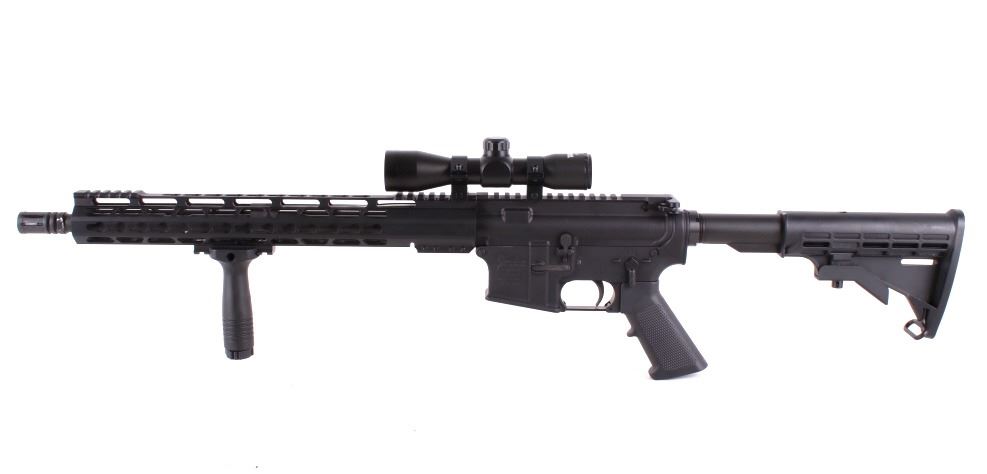 For your consideration is a custom .223 Wylde TacFire AR 15. This custom AR is built on the .223 Wylde platform which can safely shoot three caliber's; the 5.56 NATO, .223 Remington, and .223 Wylde cartridges. This rifle is built on an Anderson Manufacturing stripped lower. The rifles features a black plastic pistol grip and adjustable butt stock. The 7075 T6 aircraft grade aluminum receiver features a black anodized finish. The upper has a forward assist and picatinny rail along the front and rear of the barrel along with Mlok accessory mounts at four sides of the hexagonal hand guard. Mil-Spec Bolt Carrier Group Assembly machined from 9310 heat treated steel with corrosion resistant black nitride finish. The 16" parkerized barrel has a 1:7 twist and is surrounded by a slim Mlok free floating hand rail. Attached to the rifle is a TacFire 4x32 aluminum scope. Serial Number: 17046558. This is a modern firearm and requires a FFL transfer or NICS background check.