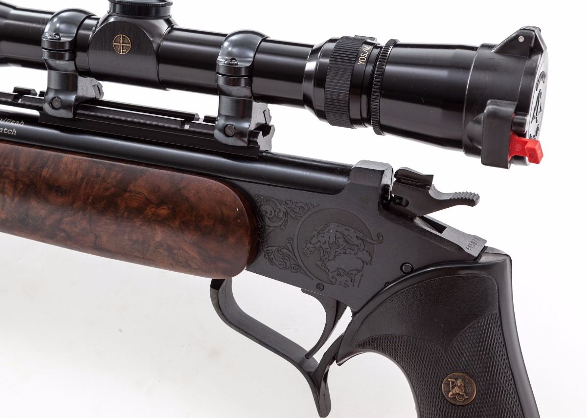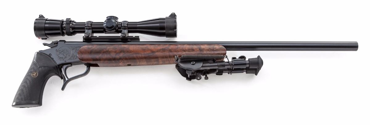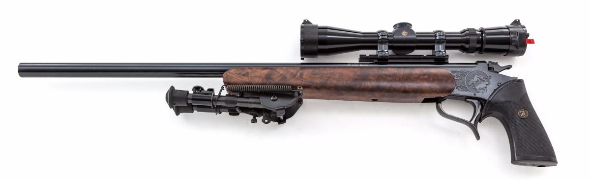 Custom Thompson Contender Single Shot Pistol, #445871, .22 LR cal., 24'' Bullberry Match barrel, blue finish, black checkered hard rubber Pachmayr presentation grips, what appears to be a black walnut custom forend, with Harris Ultra-Light bipod. Topped with a Leupold Vari-X III 2.5x8 scope. Condition is excellent, appearing near new, showing just light marks from handling. Bore is bright with sharp rifling, scope optics are bright and clear. Est.: $600-$900. (Modern/PPT)