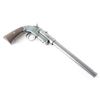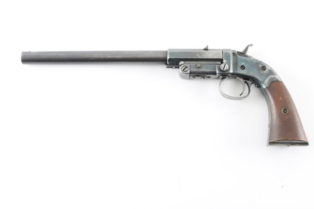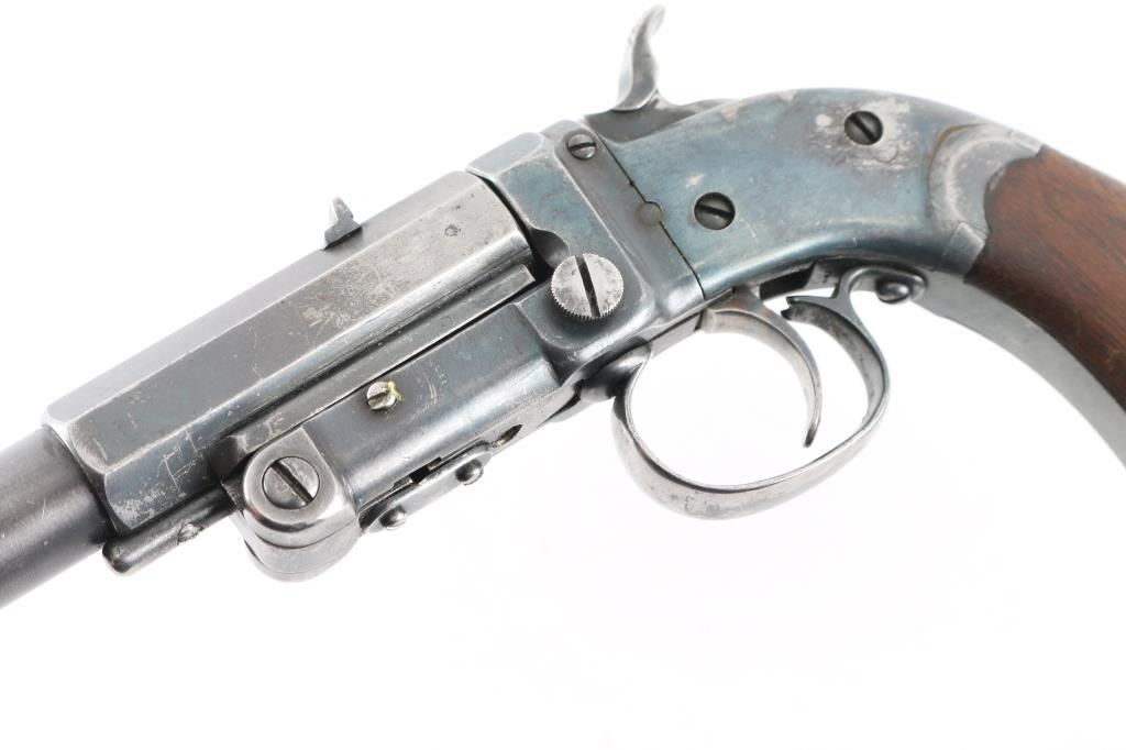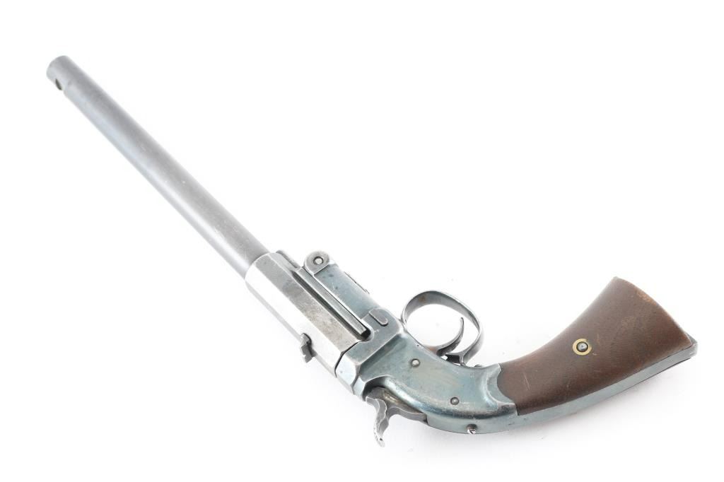 Possibly custom made, as it is unmarked, including under the grips. In the style of a Stevens. 9 3/4" octagon to round barrel, dovetailed for front sight, but sight is missing, u-notch rear sight. Push button break-top, checkered spur hammer. Blued finish is about 60% with scratches, edge, and handling wear, barrel locks up tight, action is crisp, bore appears excellent/bright. Grips are very good+. NRA Condition-Very Good. Modern firearm