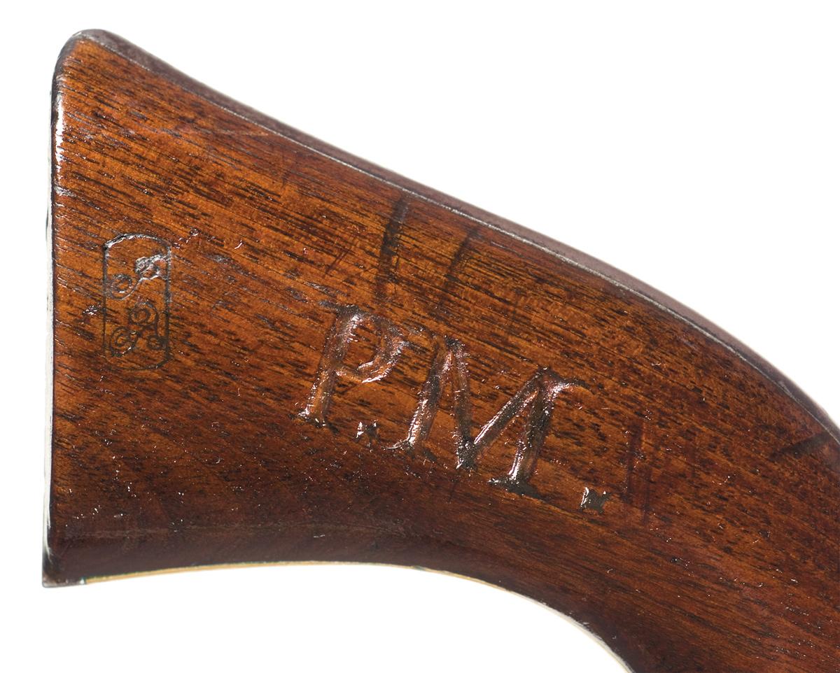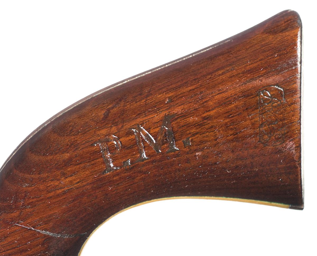 Manufactured in 1862, with a 3 screw frame cut for a shoulder stock. The top of the barrel has the one line New York U. S. America address flanked by dashes, "COLTS / PATENT" on the left side of the frame and the Texas naval battle scene on the cylinder. Inspector initials on various parts. Matching serial number on the barrel, frame, trigger guard, and backstrap and partial number "1649" on the cylinder, wedge and arbor pin. Fitted with a smooth walnut grip stamped with boxed "GDL" cartouche on the left side and boxed "JT" on the right side. There is a large "P.M." stamped (branded) in the middle of both sides of the grip.