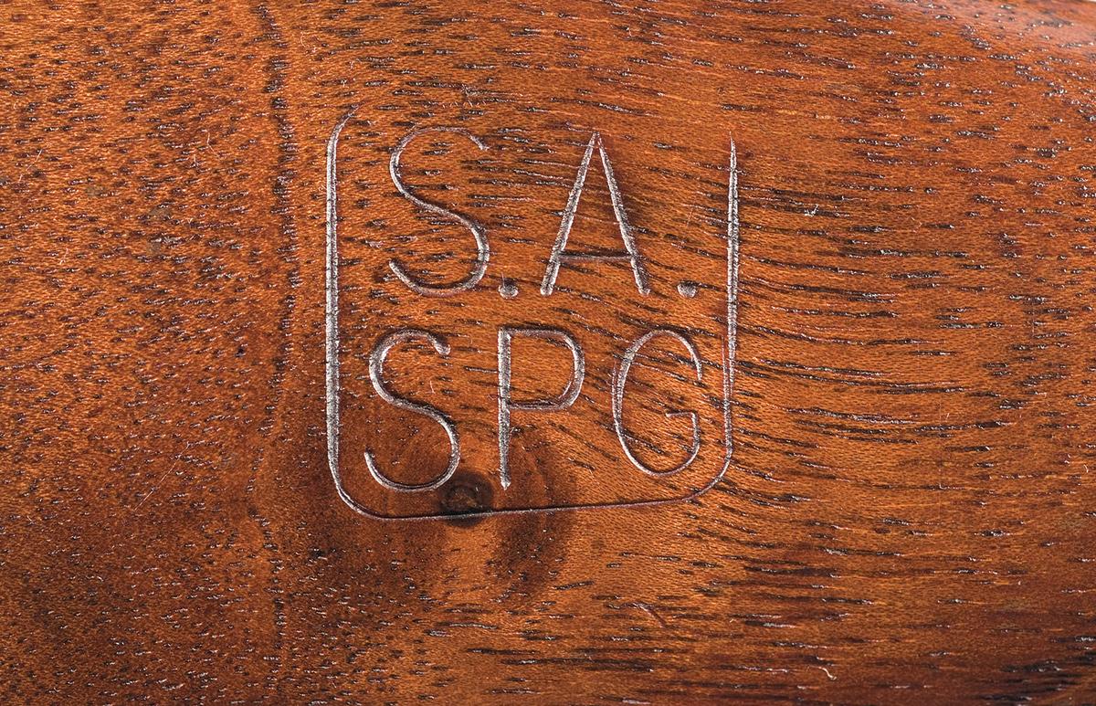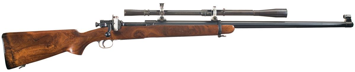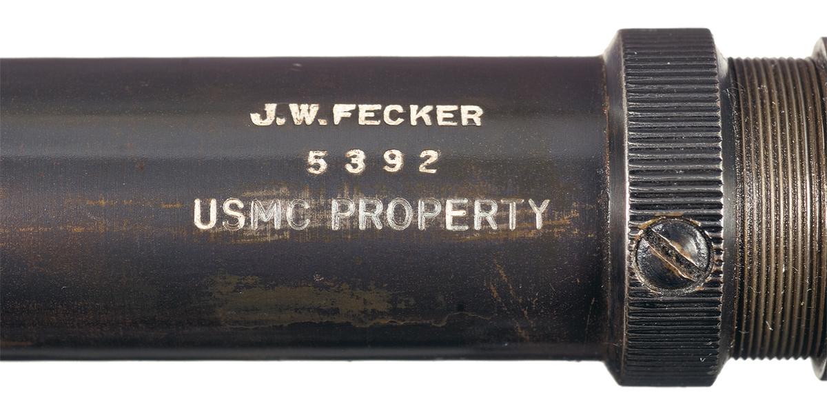 This is a very nice example of a standard 1903 Springfield rifle that was assembled or built up as a "T" style target rifle. The serial number of this rifle falls into the generally accepted serial number range of the "T" rifles, however there is no documentation that accompanies this rifle. The top of the receiver has the standard 1903 markings over the serial number. The barrel is unmarked and has eight lands and grooves and is correctly fitted with the modified BAR style front sight base with a Lyman globe front sight similar to the M77 with a Lyman 48C micrometer rear sight. The rifle is fitted with a current copy of an original "T" style target stock with a "C" style pistol grip, with short forend and a model 70 or Neidner style metal buttplate. The left side of the stock with a re-stamped boxed "SA./SPG" and the barrel is held in place with a correctly style modified 1917 barrel band. The rifle has been drilled and tapped for a set of scope blocks on top of the barrel and it is currently fitted with an early J.W. Fecker target scope. The markings on the scope tube are "J.W. FECKER/ 5392" and below that is has been nicely marked "USMC PROPERTY". The markings appear to be milled into the tube and although not authenticated they are of the correct style. The scope is accompanied by an unmarked Lyman style wooden scope box. The rifle has been given a very nice high polished blue finish and the scope retains it original pre-war style blue finish and the stock has a nice oil finish. The consignors notes state this type scope is discussed on page 109 and 110 of the book "U.S. Marine Crop Scout-Sniper For WWII and Korea" by Peter Senich. The rifle was also reportedly obtained from a retired Federal Judge from Washington D.C., and was part of a U.S.M.C. display in D.C..