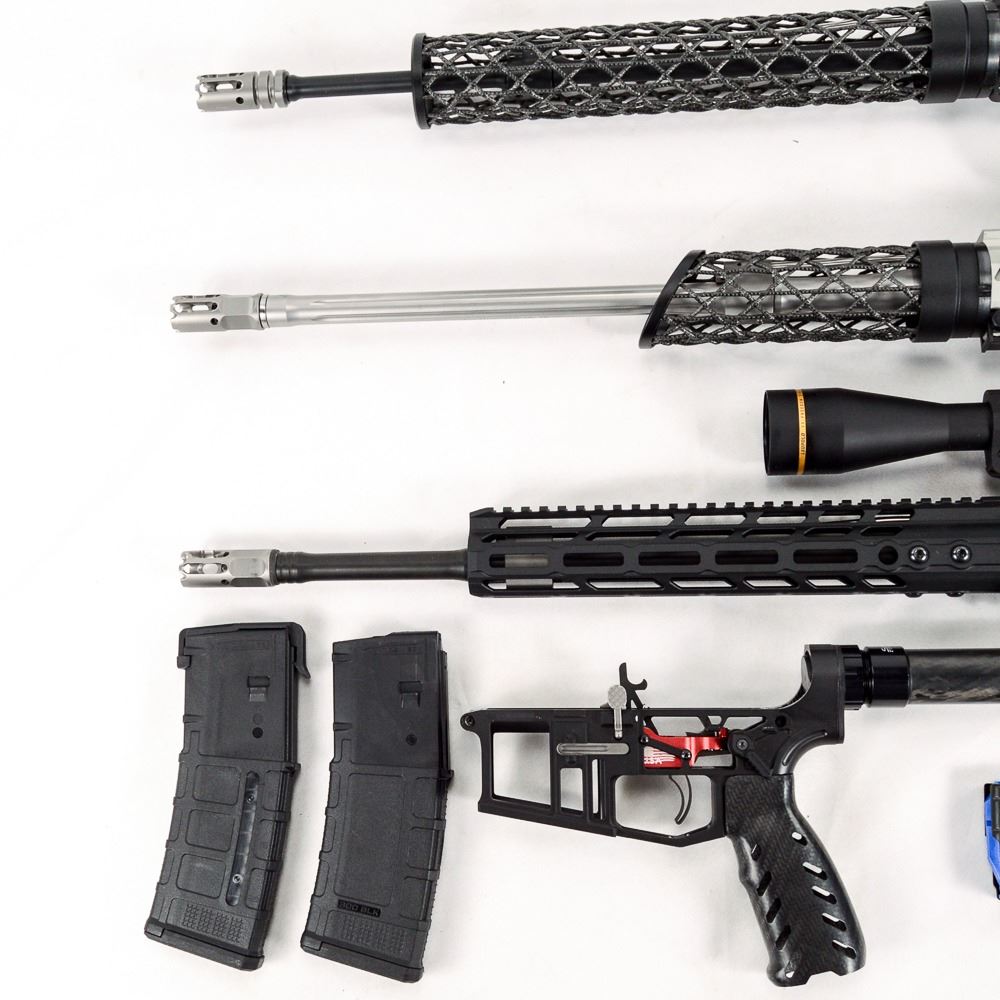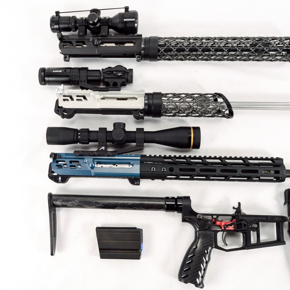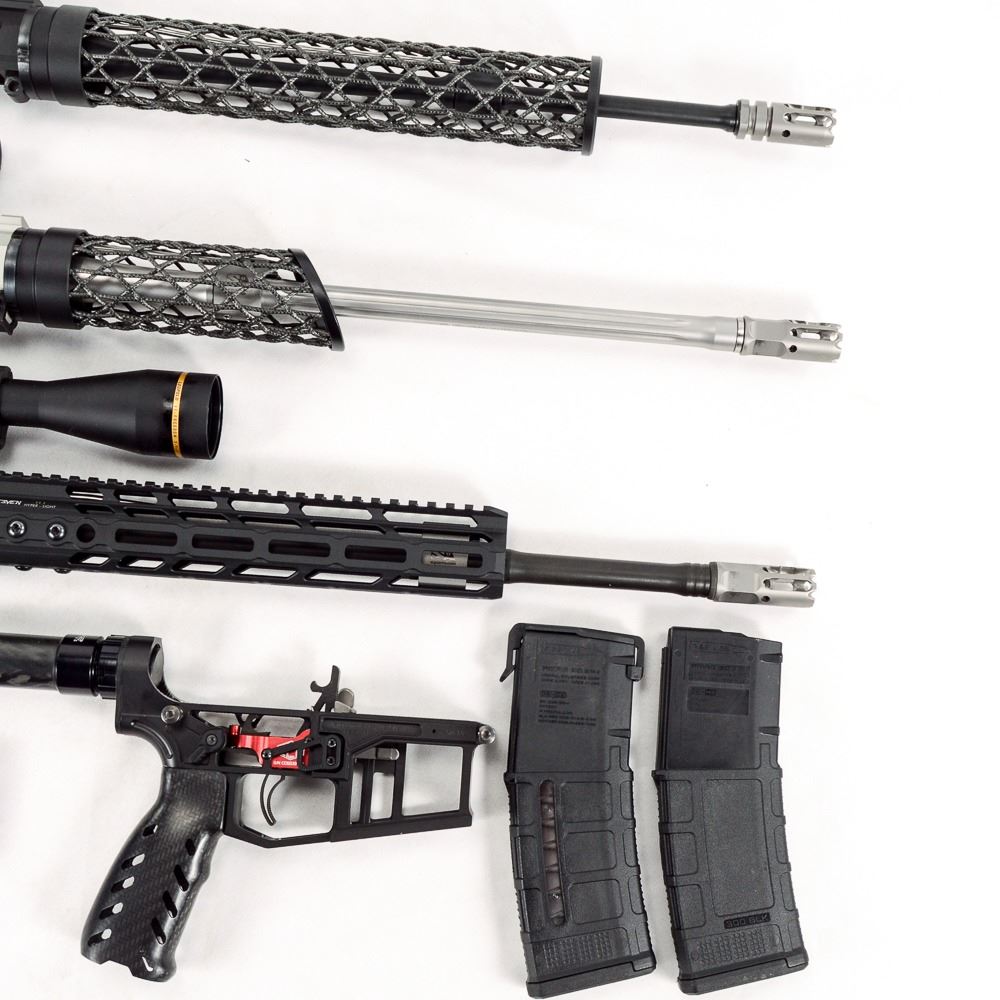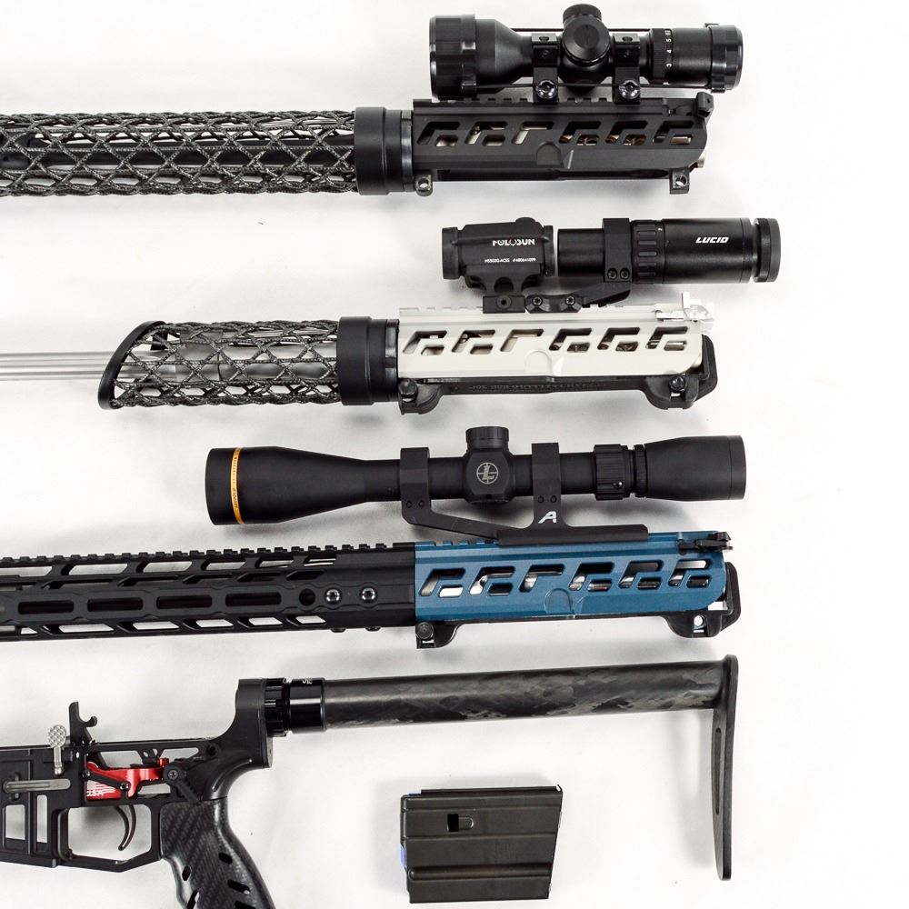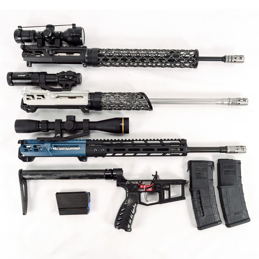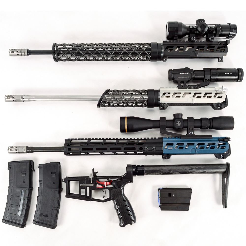 LOWER: War Dog Advanced Lightweight lower, Armaspec Superlight builders kit, Smoke Composites stock, castle nut, tube and grip, titanium grip screw and mag catch, V Seven ultra lite bolt catch, Elftmann trigger group, Armaspec ext mag release -.223 Wilde Upper War Dog advanced lightweight upper with Faxon 16" pencil UL barrel, Brigand Arms Edge 12" fore-end, Fostech complete bolt carrier group, Strike latchless charging handle, 2A T3 comp 556nato titanium blasted, Alpha one gas block Aimsport 3-9x40 illuminated scope. -300 Blackout upper War Dog upper, Wilson Combat 16" fluted Recon threaded barrel, 7" Brigand Arms hand guard, Fostech lit bolt carrier, Presma Ambi charging handle, 2A X3 comp titanium blasted Superlative Arms adjustable gas block, stainless gas tube, Lucid 2-5x magnifier, Holosun Paralow red dot -6.5 Grendel upper War Dog upper, Faxon Match series 16" 416R Nitride Nickel teflon finish barrel, Madnesium hyper-light M-LOK handguard, JP Enterprizes low mass bolt carrier, V Seven chrging handle, 2A X3 titanium blasted, Superlative Arms adjustable gas block and stainless tube and Leupold VX-Freedom3-9x40 scope. S/N:SR150840
