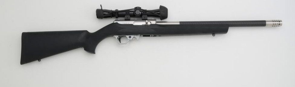 Custom Volquartsen semi-auto target rifle based on the Ruger 10-22 design, .22LR cal., 18-1/2” ported barrel, neoprene stock, #PP00728, mounted with a Leupold VX-1 2-7 x28mm RIMFIRE scope. This gun is in like new condition showing little handling or use and the optics of the scope are crisp. Est.: $500-$1,000.