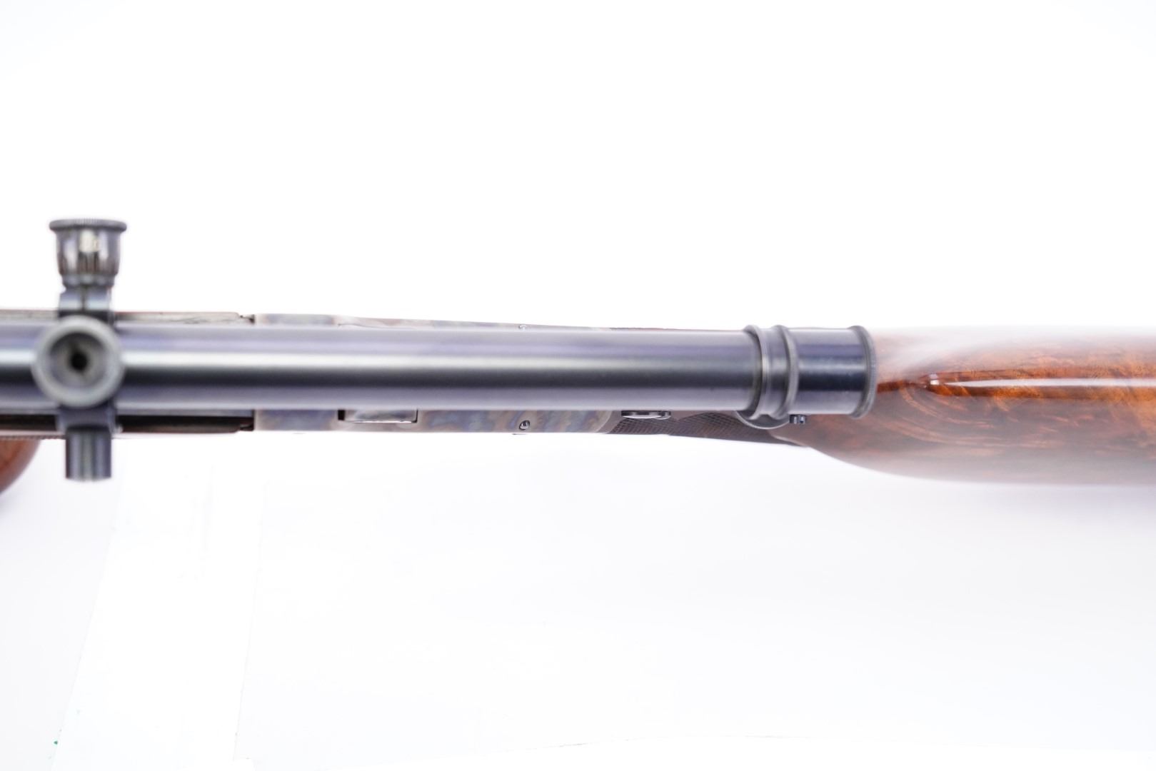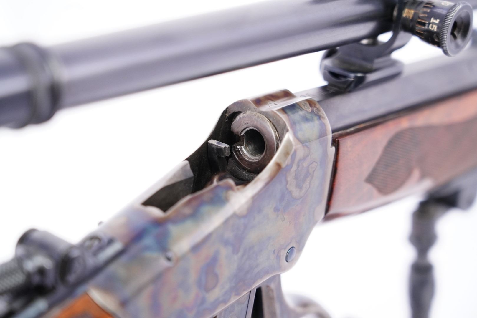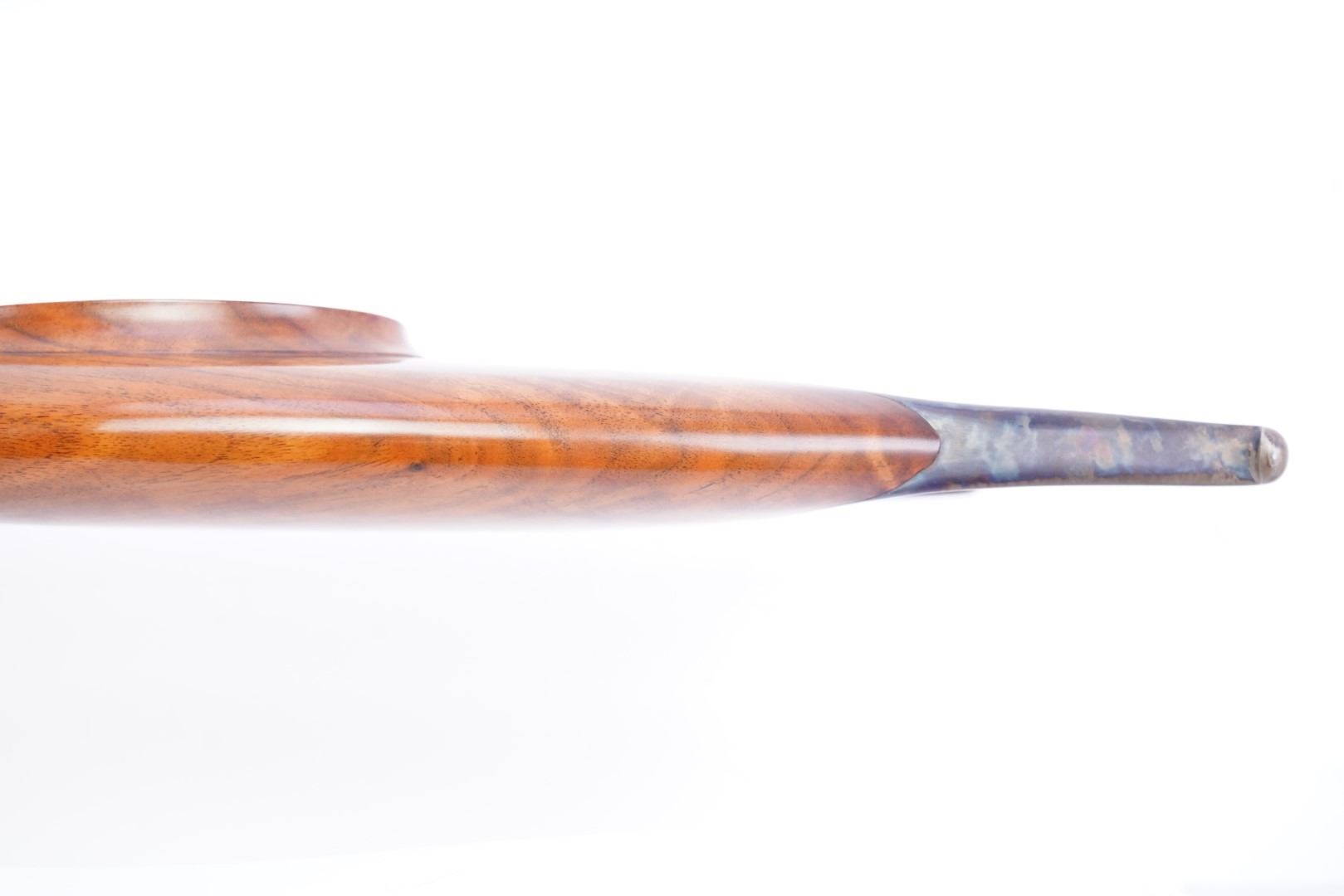Overall Condition: This rifle retains about 97% of its metal finish. The top of the receiver has a blindly filled hole. The top and top shoulders of the octagonal barrel have been textured for glare reduction. There are a couple light marks. The bottom tang is proud to the receiver. There are some scattered little areas of discoloration from previous oxidation and a few spots of light erosion on the frame which are under the finish. There are some light machining marks on the muzzle. The markings are clear and were remarked at the time of restoration. The screwheads show light use. Overall, this rifle is in excellent condition.