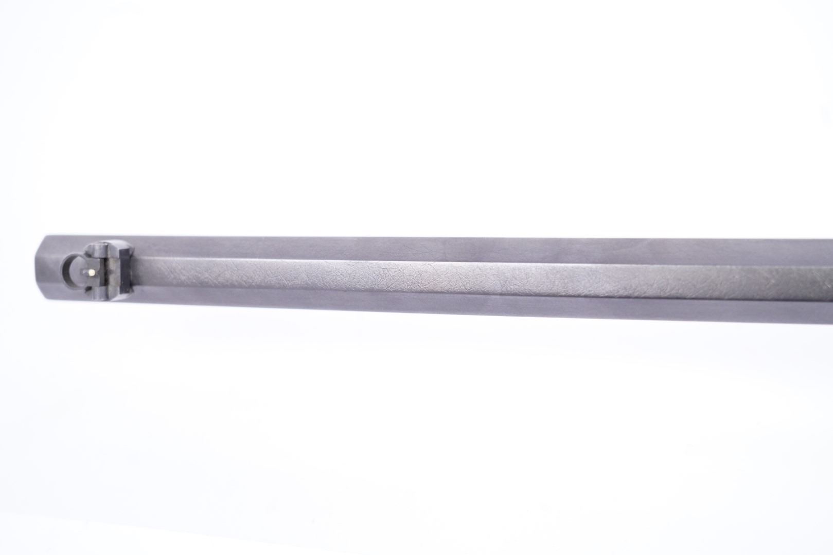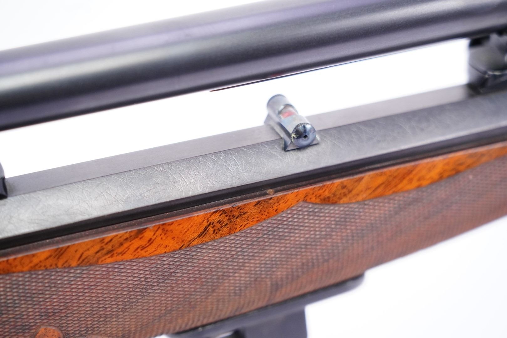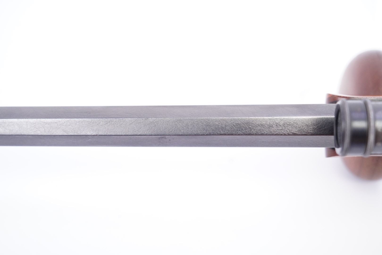 Overall Condition: This rifle retains about 97% of its metal finish. The top of the receiver has a blindly filled hole. The top and top shoulders of the octagonal barrel have been textured for glare reduction. There are a couple light marks. The bottom tang is proud to the receiver. There are some scattered little areas of discoloration from previous oxidation and a few spots of light erosion on the frame which are under the finish. There are some light machining marks on the muzzle. The markings are clear and were remarked at the time of restoration. The screwheads show light use. Overall, this rifle is in excellent condition.