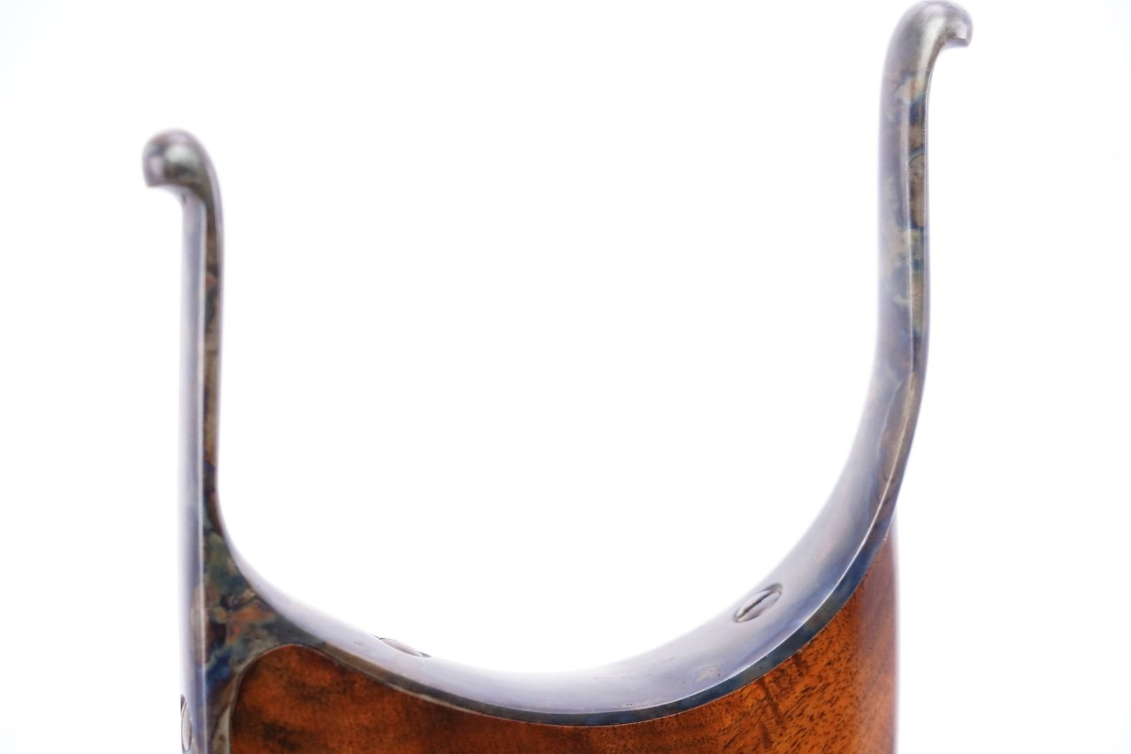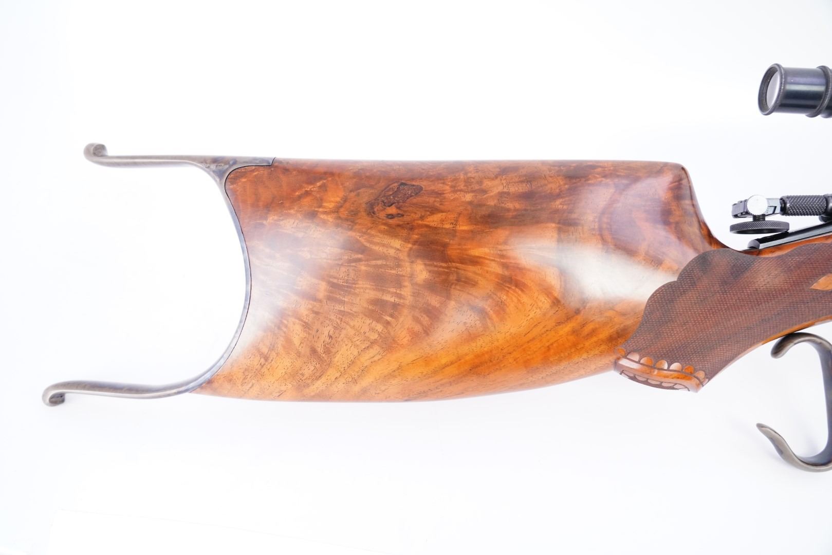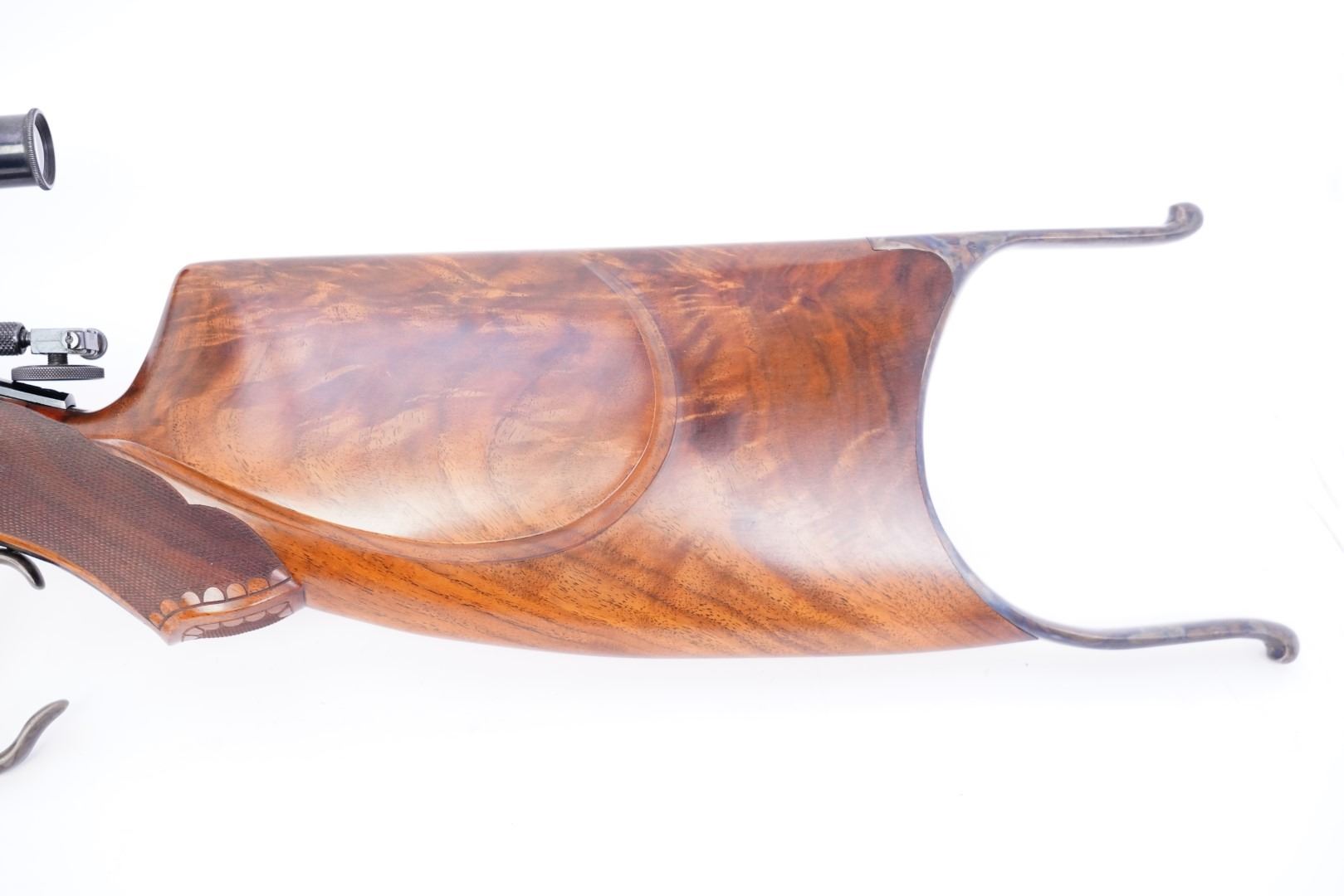 Stock Configuration & Condition: The custom stocks are two-piece checkered walnut with fleur di lis accents. The stocks have an "S'' bottom pistol grip, straight comb, cheekpiece, perch belly, Schuetzen palm rest, and metal Schuetzen buttplate. The fitment is shy in areas and proud in others. There are a few light handling marks and minor compressions. The checkering is strong. The LOP measures 12 3/8″ and 11 1/2" from the fronts of the triggers to the back of the buttplate. The plate has a few areas of erosion and marks in the metal. There are a few little spots of discoloration. The case color is strong. Overall, the stocks are in Fine Plus condition.