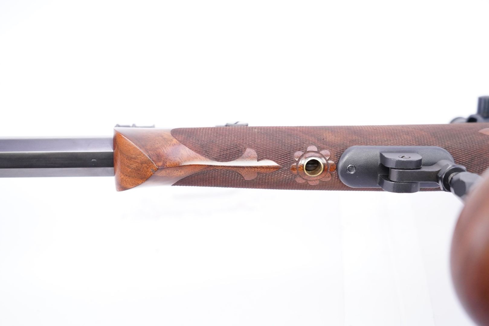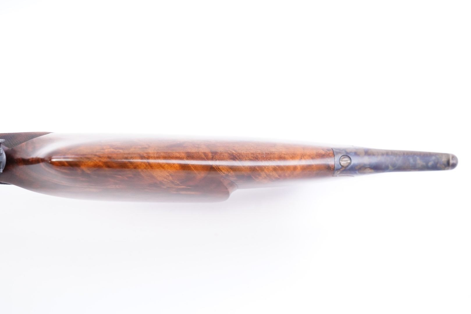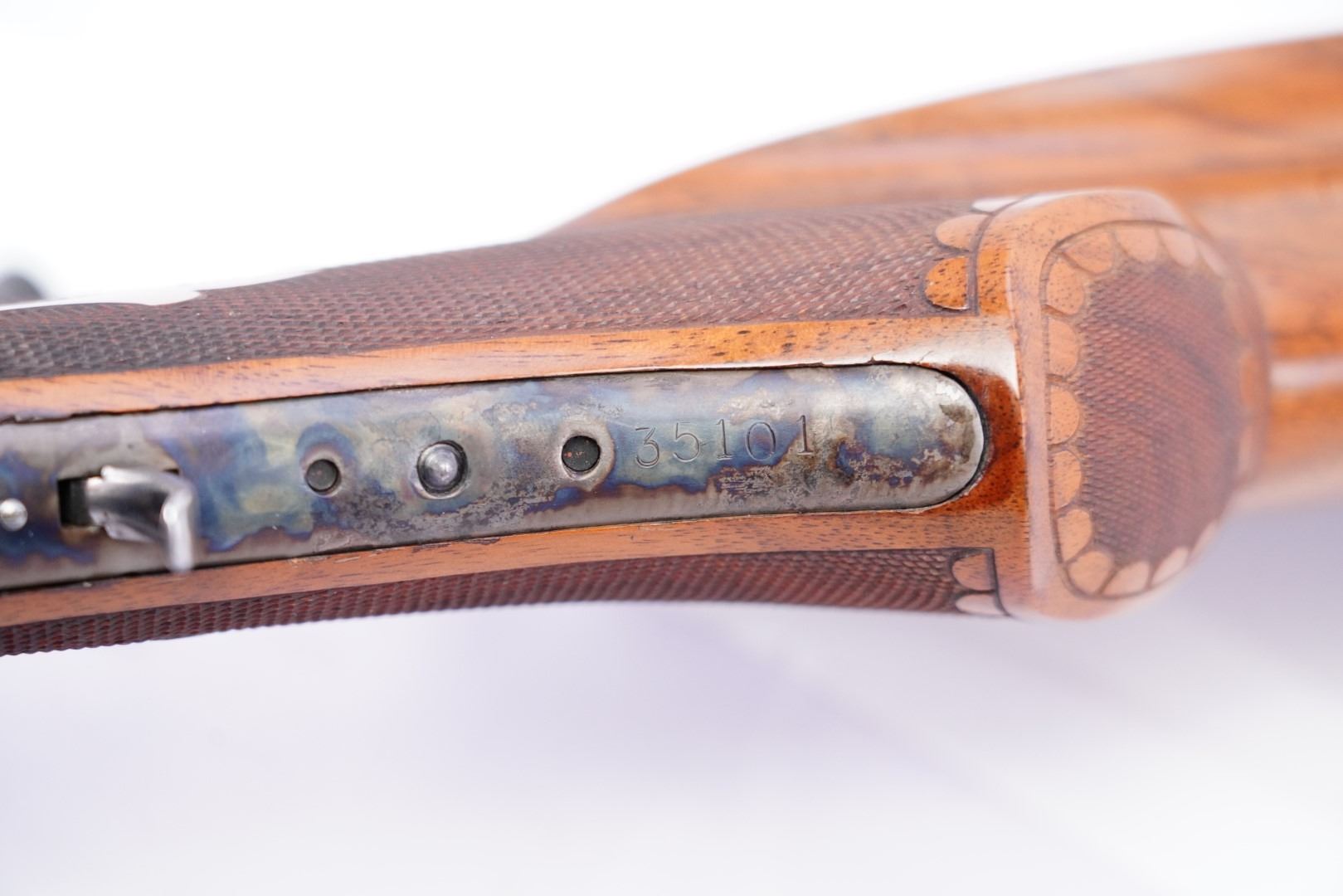 Stock Configuration & Condition: The custom stocks are two-piece checkered walnut with fleur di lis accents. The stocks have an "S'' bottom pistol grip, straight comb, cheekpiece, perch belly, Schuetzen palm rest, and metal Schuetzen buttplate. The fitment is shy in areas and proud in others. There are a few light handling marks and minor compressions. The checkering is strong. The LOP measures 12 3/8″ and 11 1/2" from the fronts of the triggers to the back of the buttplate. The plate has a few areas of erosion and marks in the metal. There are a few little spots of discoloration. The case color is strong. Overall, the stocks are in Fine Plus condition.