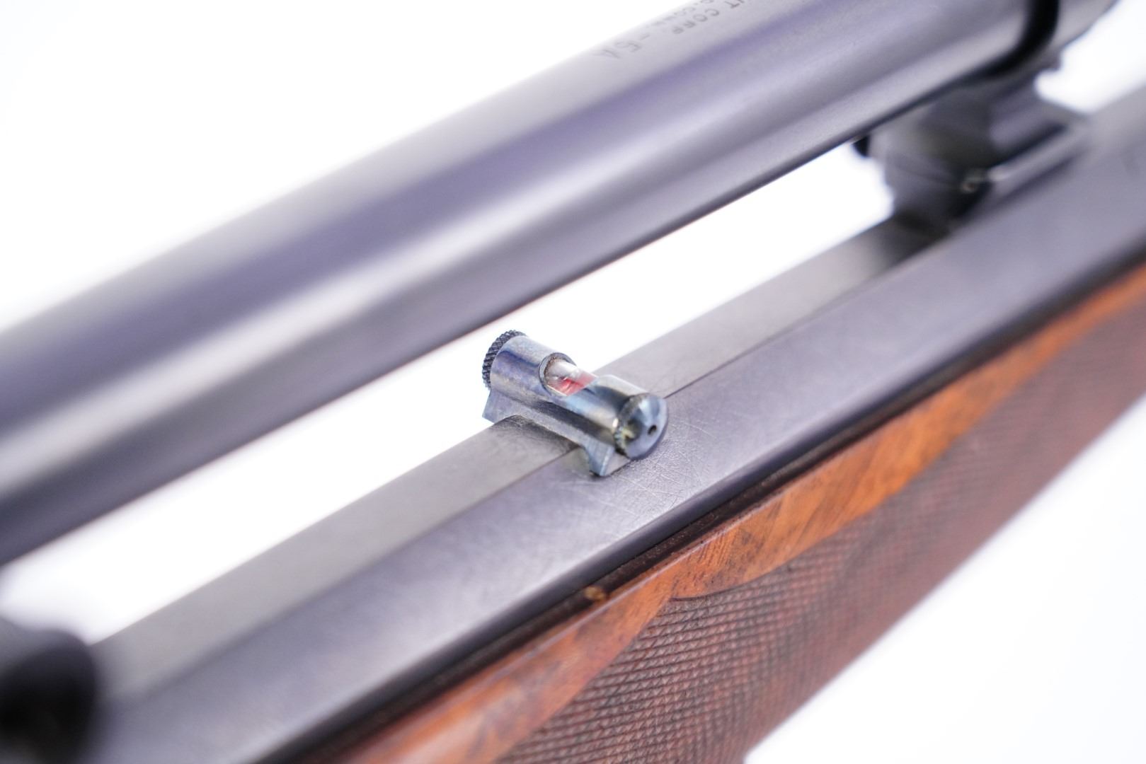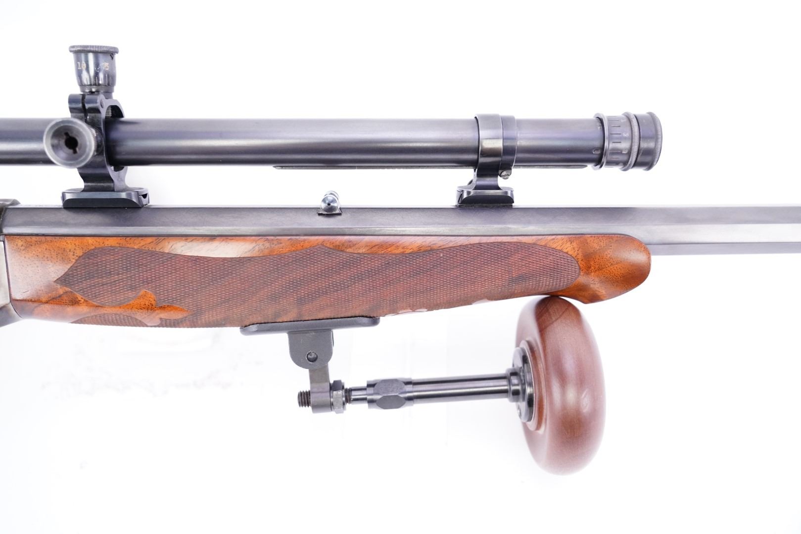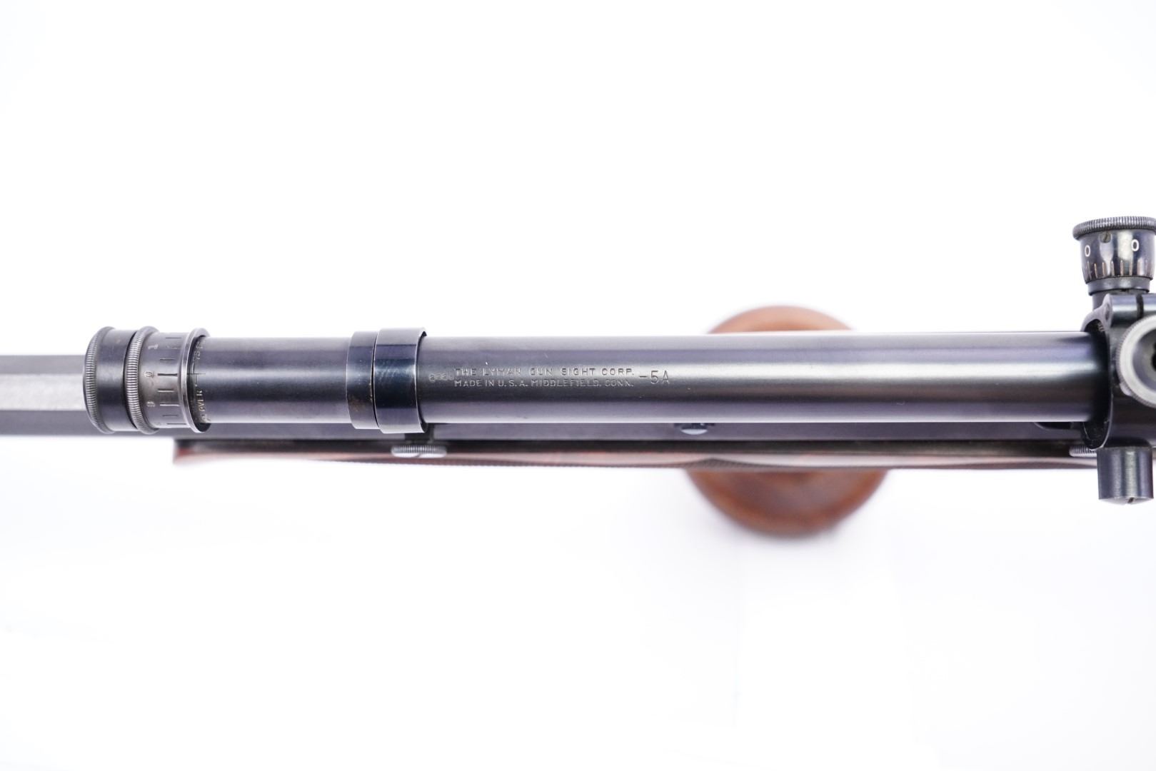 Sights / Optics: The front sight is a folding globe sight with a post inside the globe and a white beaded blade when flipped down. The front sight is dovetailed into the barrel. The rear of the barrel is installed with a spirit bubble level in its dovetail cut. The top tang is installed with a folding Lyman aperture peep sight. The top of the barrel is installed with target bases and a pair of rings holding a Lyman No. 5 scope. The scope has some minor marks and finish wear to the surfaces. The scope has a crosshair and the glass is clear. The scope rates in Fine condition. The top and sides of the barrel have been matted for glare reduction.
