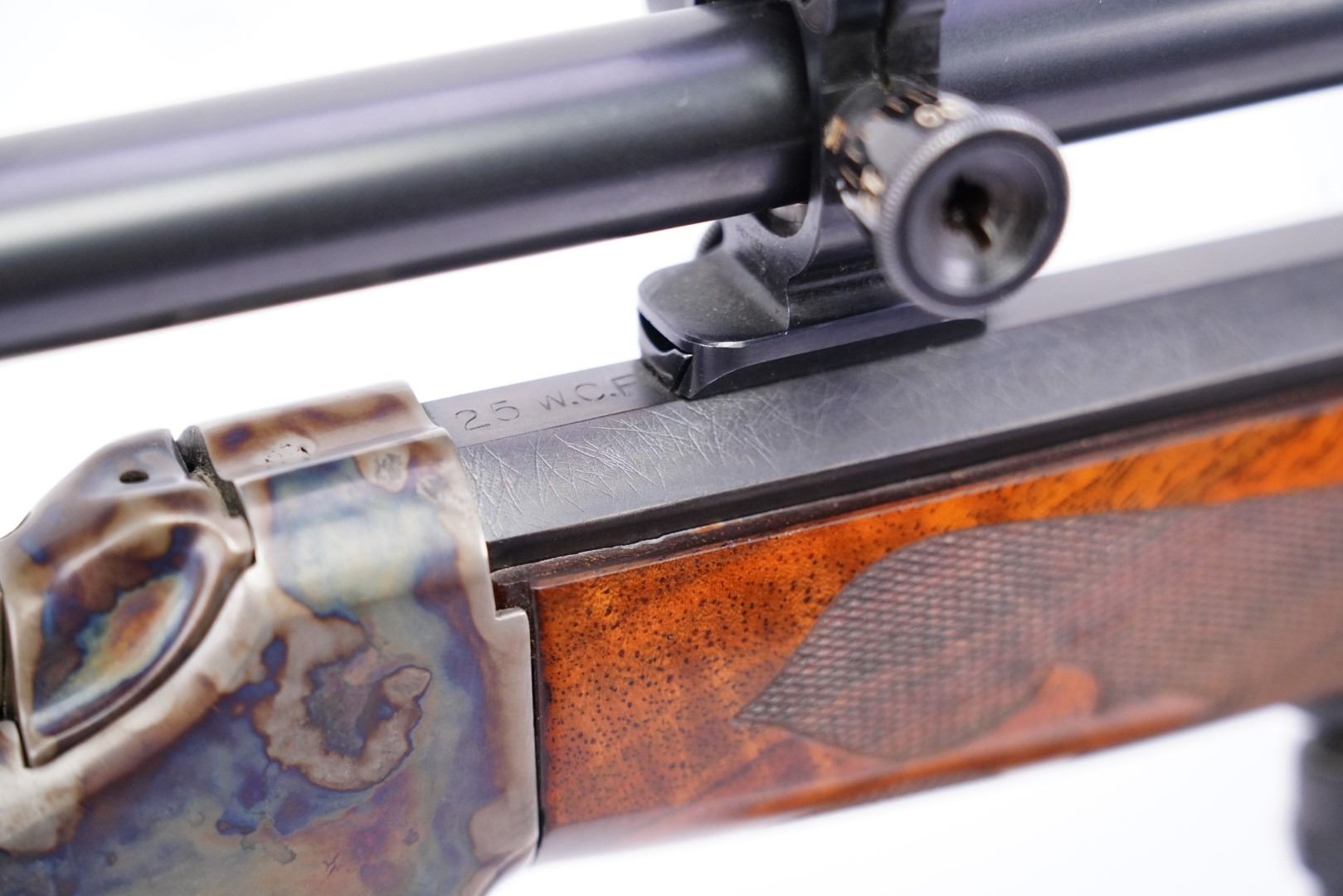 Our Assessment: When they were first manufactured, the John Browning designed Winchester Model 1885 rifles were deemed stronger than the prior Sharps rifles, and the different sight and trigger options available made them an instant hit with hunters and target shooters alike. The Model 1885 rifles were targeted at competitors in "Match Shooting", a sport which was extremely popular from about 1871 to 1917. The Winchester rifles challenged the Sharps, Remington, Maynard and Ballard rifles, and quickly became known for their reliability and accuracy. Major Ned Roberts, inventor of the .257 Roberts cartridge, described the Model 1885 as "the most reliable, strongest and altogether best single shot rifle ever produced". Alternately translated as "shooter" and "marksman", Schuetzen also refers to a German shooting sport from the turn of the 20th century. As with many types of firearms, gunmakers took the design and manufacture of Schuetzen rifles to the extreme, with elaborately carved stocks, engraved receivers, and capable of astounding precision. This Winchester 1885 Low Wall has been transformed into a work of art and is simply beautiful. It is now a Schuetzen rifle with double set triggers and has been rechambered and rebored for .25 WCF. The lever has been customized to represent Winchester’s final style of Schuetzen lever. The metal has been restored to a vibrant case color and soft blue. It has been set in beautiful checkered walnut stocks and is topped with nice iron sights and a Lyman 5A scope. Not only does it look gorgeous, but it should shoot well too! The bore is bright with sharp rifling and is free of erosion. This will be a nice addition to any collection! Please see our photos and good luck!