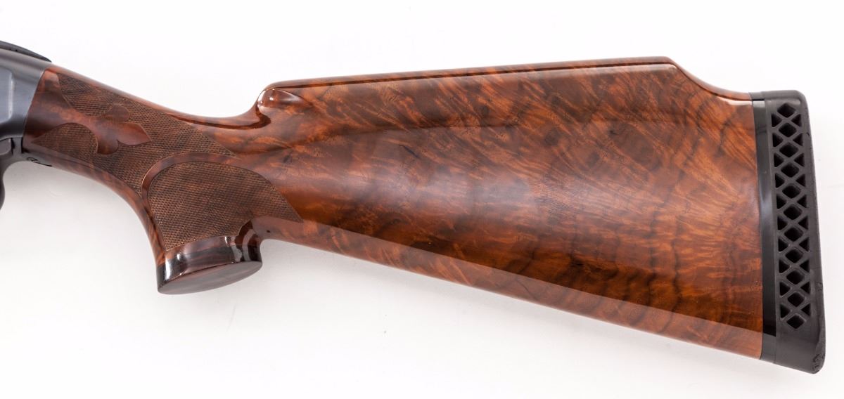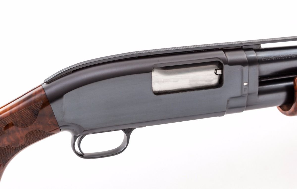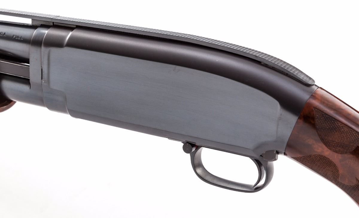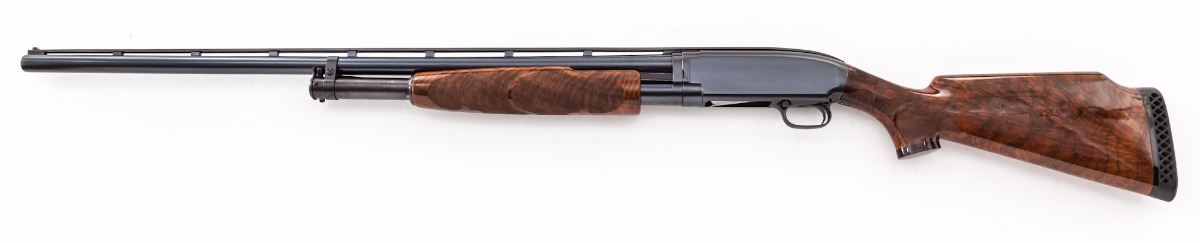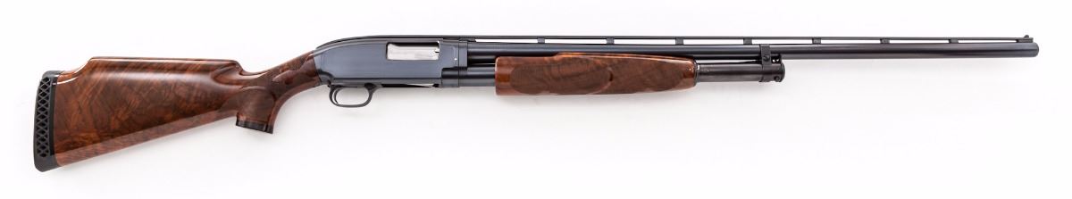 Custom Winchester Model 12 Slide Action Shotgun, #355227, 12 ga., 2-3/4'' ch., blue finish, 30'' barrel with matted 3/8'' ventilated rib, white Bradley front bead and middle white bead, with a Full choke; receiver with triggerguard mounted push button safety; Monte Carlo stock and beavertail target forend are AAA Grade flame figure walnut with a high-gloss finish and 24 line-per-inch fleur de lis bordered checkering with flared rosewood grip cap. Length of pull is 14-3/8'' over a 1'' black Pachmayr recoil pad, drop at comb is 1-1/4'', drop at MC is 1-1/8'' and drop at heel is 1-3/4''; weight is 8-5/8 lbs. Mfg'd ca. 1924. Overall condition is very good as completely redone, with moderate wear and light pitting on bolt face. Reblue remains approx. 98% with cycling wear on the magazine and a few areas of original underlying pitting, noticeably in and around the barrel serial numbers, with a chipped lower tang screw. Stock and handle remain 99%+ with a few small marks. Action is tight, bore has accumulated gray fouling. Est.: $800-$1,200. (C&R)