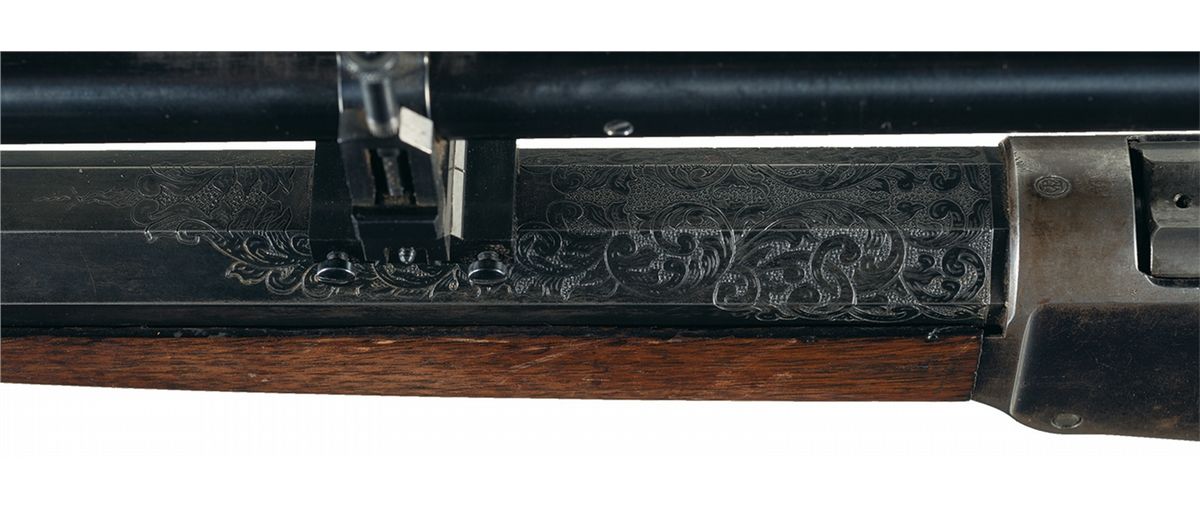 Very good as custom built. The rifle retains half of the custom blue finish with some edge wear and thinning on the barrel, and some areas of smooth gray patina on the receiver. The lever shows 40% original faded case colors with a smooth silver gray patina on the balance. The wood is also very good overall. There are two filled holes on the underside of the forearm, a streak of rough varnish on the stock, and overall some minor handling marks. The scope is very good with 90% original finish remaining with a small area of smooth gray patina, some normal usage wear and clear optics.
