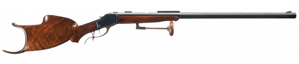 Manufactured in 1918. Features a #4 half octagon barrel with a blade front sight, re-cut rear sight dovetail and two scope base are mounted on the rear portion of the barrel. The upper left barrel flat at the breech is marked "22 SHORT" and the Winchester oval proof is marked on the top barrel flat and top of the receiver at the breech. The bottom of the barrel ahead of the forearm is marked "4" and "22 RF" under the forearm. The upper tang has the three line patent date, Winchester, trade mark marking, with the serial number on the lower tang. Spur lever, double set triggers and mounted with a smooth walnut forearm with ebony forend insert, added palm rest and replacement Schuetzen style pistol grip stock with high cheek piece and long prong steel buttplate.