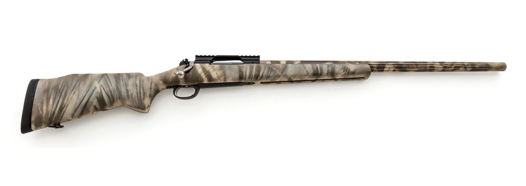 Custom Winchester Model 70 Bolt Action Rifle, #15144, .308 cal., 24'' medium-weight fluted barrel, gray/tan desert cryo-finish, matching synthetic stock, custom triggerguard and floorplate, and aftermarket adjustable trigger. Topped with Farrell made Weaver type scope mount. Matte blue receiver originally mfg'd in 1938. Condition is excellent as modified, showing very light markings from field use. Crisp action, light trigger, excellent bore. Est.: $500-$750. (Modern)