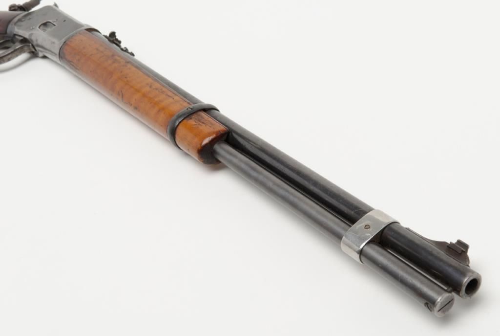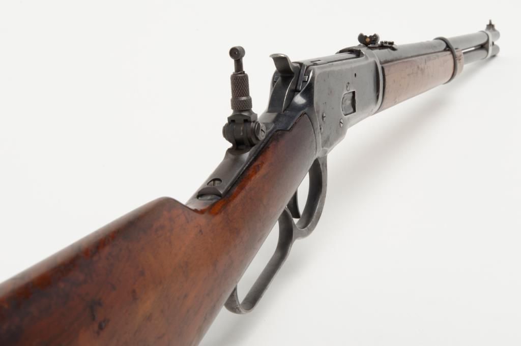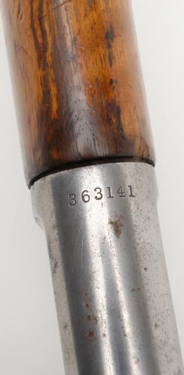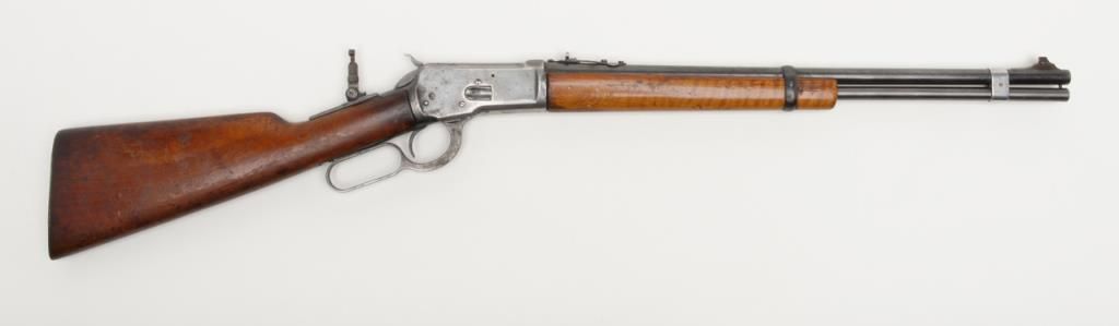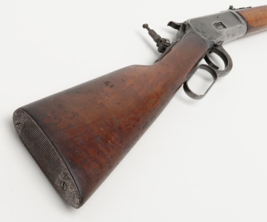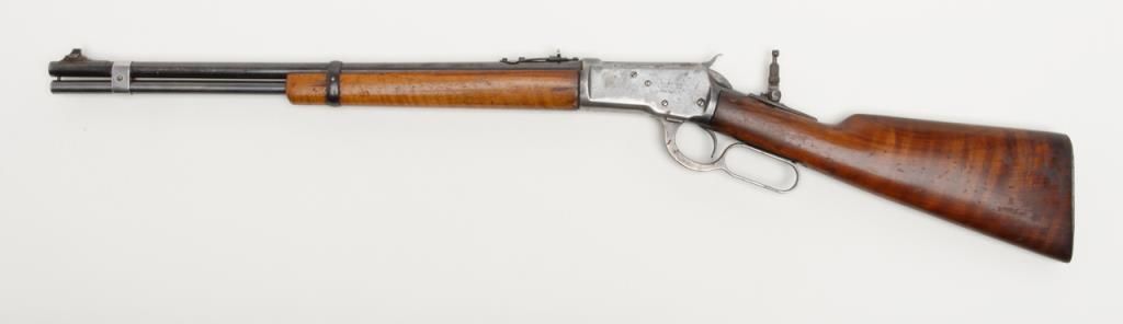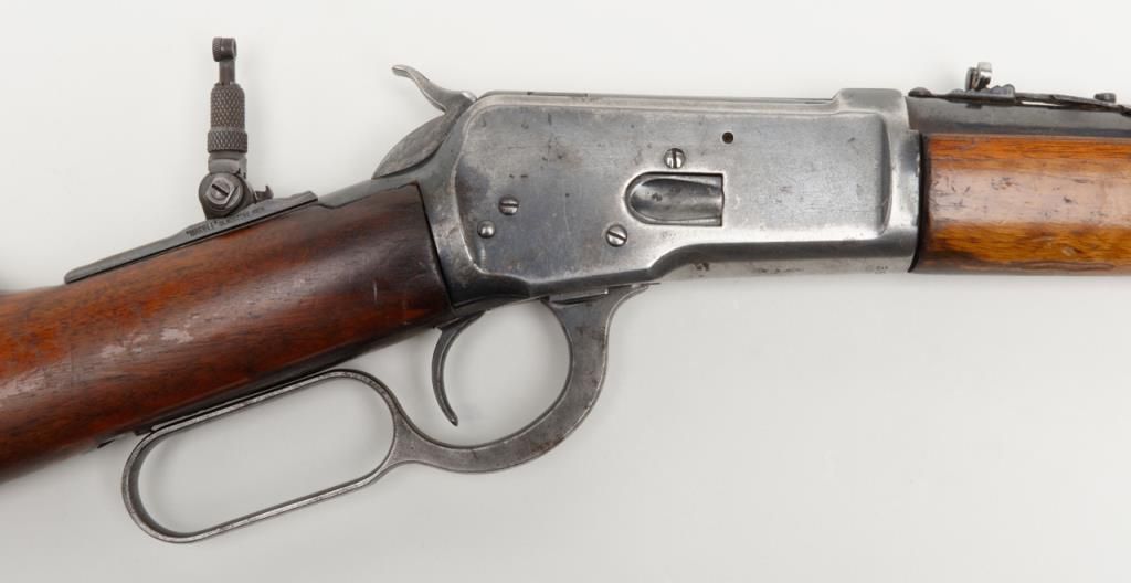 Custom Winchester Model ’92 lever action short rifle, .38 Special/.357 Magnum cal., 20” barrel, blue finish, wood stocks, #363141 in overall very good condition as customized with considerable blue on barrel and loading tube, approx. 60% blueon receiver, very good bore, crisp action, good wood with scattered mars and scratches from carry and storage, Marble’s adjustable tang sight, aluminum replacement forward barrel band (C&R). Est.: $1,000-$2,000