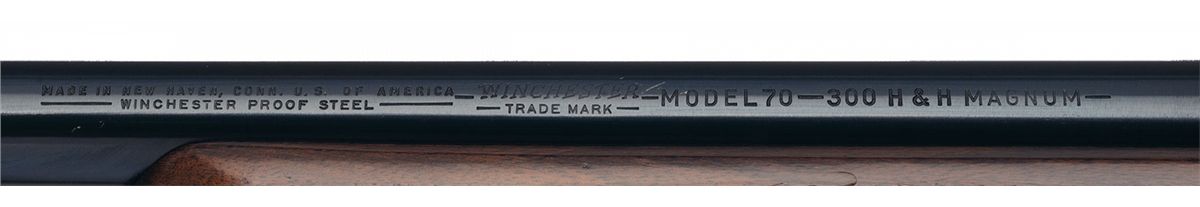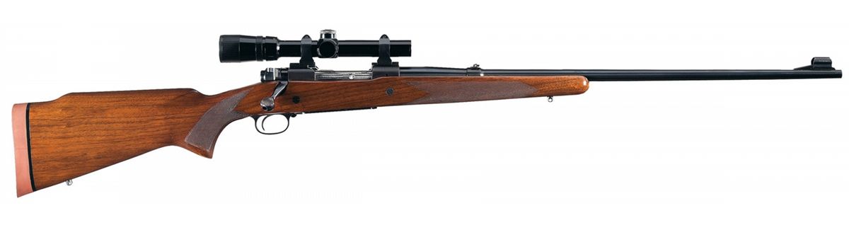 Hooded bead and flip-up adjustable rear sights. Mounted with a Bausch & Lomb Balvar 1.5 X 6 scope on quick release mounts. Jeweled bolt and follower with a checkered bolt and bolt release. Fitted with a deluxe checkered walnut monte carlo stock with engraved crossbolts, sling swivels and a unmarked recoil pad. Consignor indicates the metal was totally customized by Griffin & Howe and that the rifle has "2 New Foundland moose to her name, both 1 shot kills."