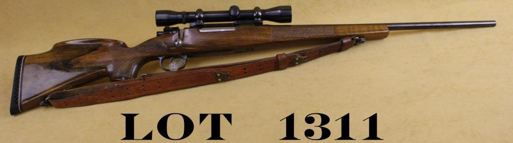 Custom bolt-action sporting rifle on 98 Mauser action, .30 caliber bore. Unmarked as to caliber and unknown. Serial #F6392. Shows Weaver scope, Bueller mounts, select custom stock. Very good used condition. Est: $150 -300