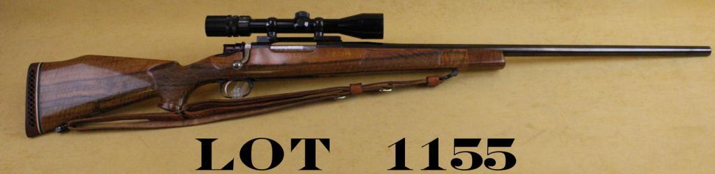 Custom bolt-action sporting rifle on 98 Mauser action, showing Flaig Ace barrel in .264 Winchester Magnum caliber, beautifully stocked in flaming grain maple, Bushnell 3x9 power scope, quick detachable sling swivels,fine to near excellent used condition. Stock attributed to Don Crecent. Would cost thousands to replicate. Serial #8905. Est: $400 - $800