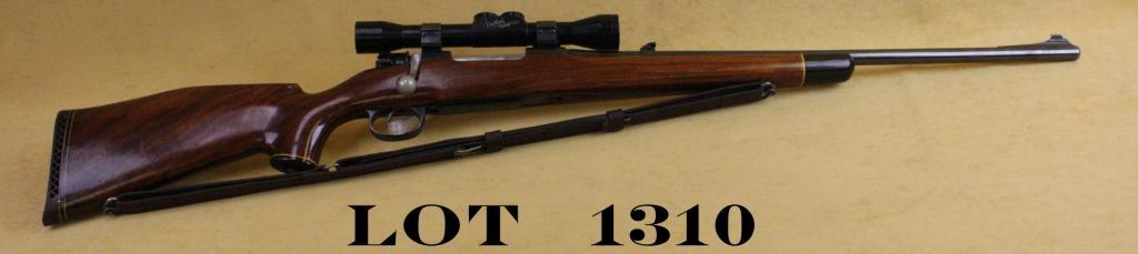 Custom bolt-action sporting rifle on 98 military mauser action. Unmarked to caliber. Weatherby scope on weaver side-swing mounts. 1950’s to 60’s styling. .30-caliber bore, with folding rear sight. Good used condition, good quality workmanship. Serial #3821. Est: $150 - $300