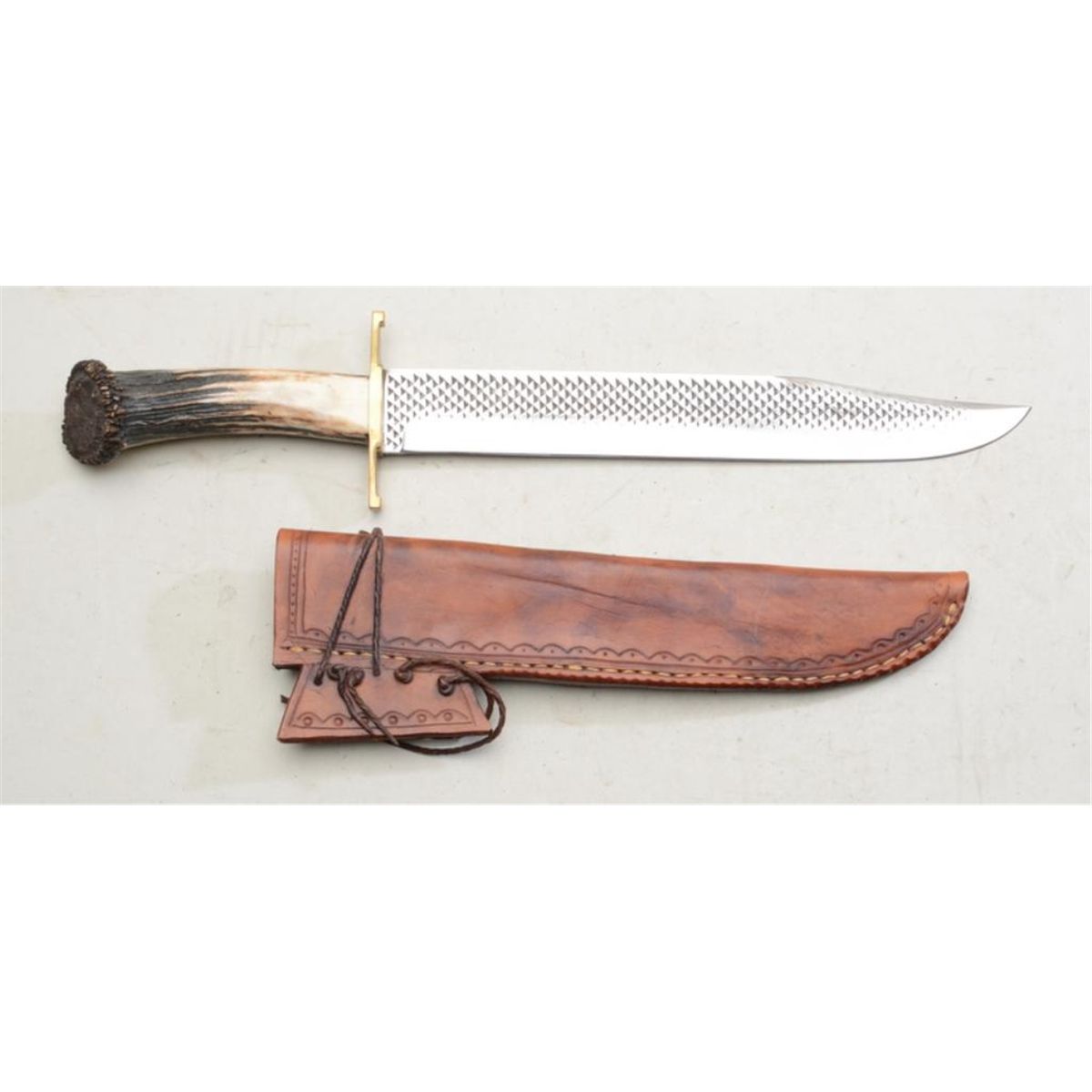 Custom clip-point bowie knife of massive size measuring 19-01/4” overall with 12-3/4” clip point blade. Stag horn grip, unsigned, blade shows triangle type decorations, brass guard, good quality, with hand-made mexicanstyle sheaths. From an old Texas collector. Blade shows original polish and grind. Near excellent. Est: $350 - $700