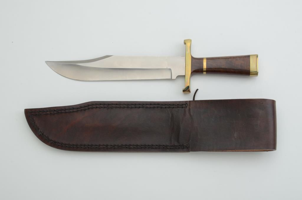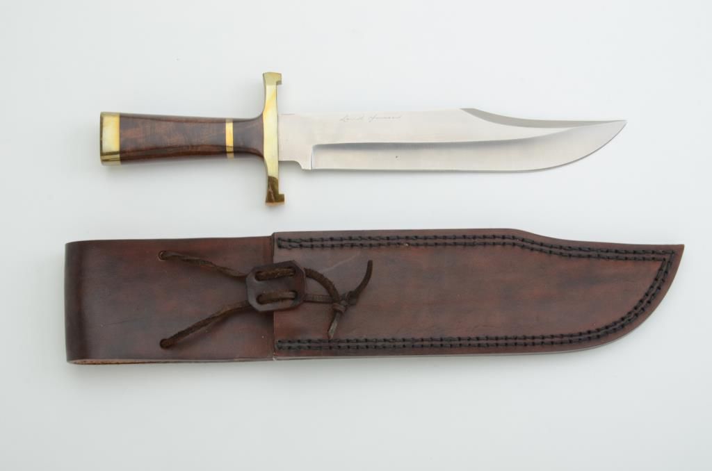 Custom clip point knife and leather sheath signed Dan H. Hanson in like new condition, approx. 13” overall with a 9” blade, brass mountings and exotic wood grip. Est.: $150-$300.