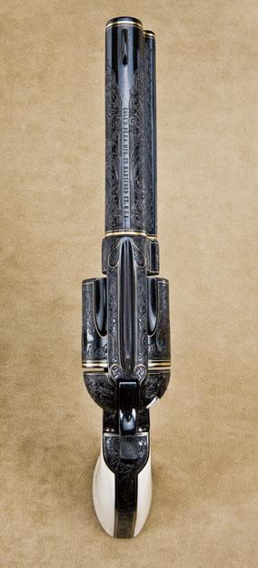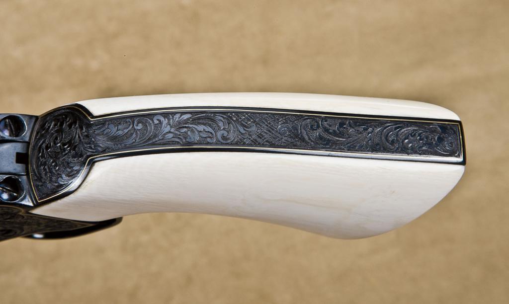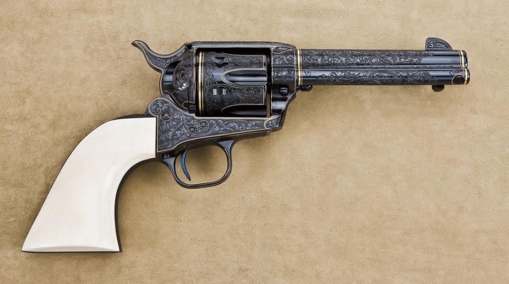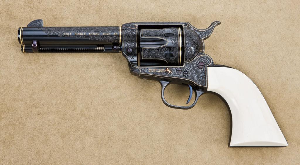 Custom deluxe “D” style engraved Colt SAA revolver by Colt Master engraver Denise Thirion and 24 K gold inlaid by Colt Master engraver Leonard Francolini, .45 cal., 4-3/4” barrel, blue finish, one- piece African ivory grips, #S18980A. This high art firearm showcases Denise Thirion’s finest Italian scroll with coverage on all parts of the revolver including the front sight and hammer. It also shows Francolini’s gold inlay work that many in the collector’s world say is unsurpassed in quality and detail. The inlay includes double banding on the barrel assembly, scrolling on the frame, cylinder, hammer, loading gate, back strap and trigger guard; gold inlay is also present as the left side barrel “Colt Single Action Army .45”, the two line patent address on the left side of the frame and a raised Rampant Colt figure behind the patent address. The finish is 99%+ and the ivory grips are excellent with beautiful graining and color. A really spectacular piece showing collaboration of two expert contemporary engraving artists. Included with this gun is a letter dated November 21, 1999 from Jim Alaimo providing additional information on this gun and the two Master engravers involved in creating this piece of artwork. Est.: $6,000-$12,000.
