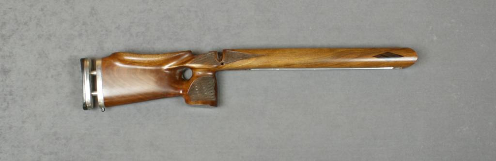 Custom deluxe prone wood stock for an  Anschutz .22 caliber target rifle with  adjustable butt plate, checkering and dark  wood diamond insets at front of stock.  Est.:   $125-$250.
