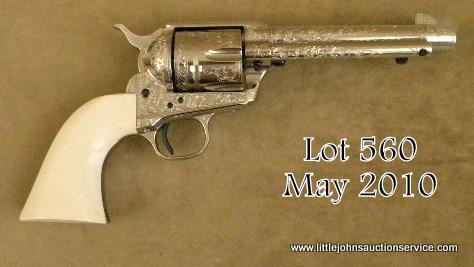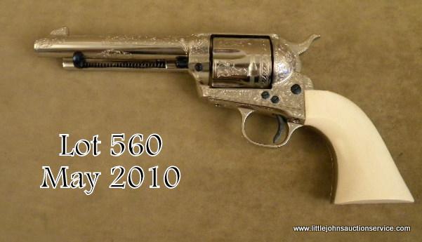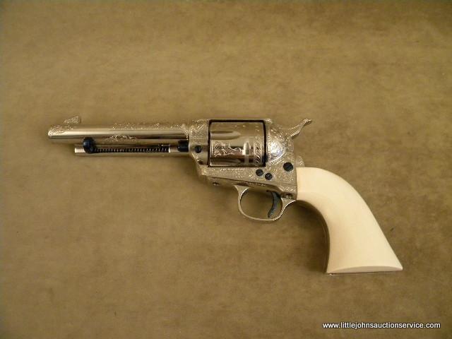 Custom engraved Colt SAA revolver, .45 cal., 5-1/2” barrel, nickel finish, fire blued screws and cylinder pin, ivory grips, #46501SA. This gun is in like new condition as custom engraved with extensive coverage including the hammer, consignor notes indicate engraving accomplished by John Adams; beautifully “grained” smooth ivory grips and inscribed on the backstrap “Peacemaker”; in addition, the gun is accompanied by a two piece Colt factory cardboard “Stagecoach” series box inoverall good condition with some wear and separation at corners. An outstanding customized second generation Colt. Est.: $3,500-$5,500.