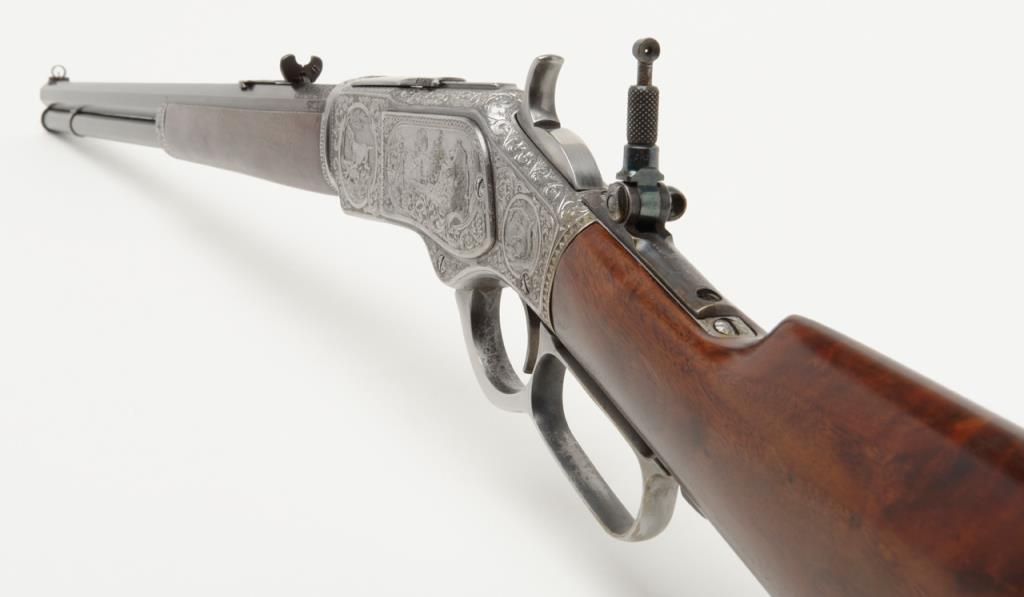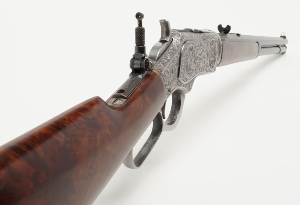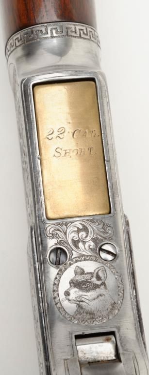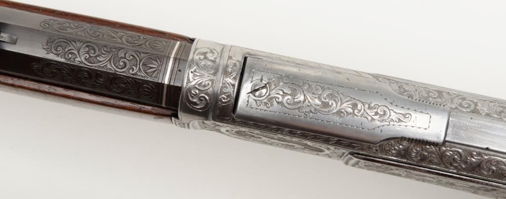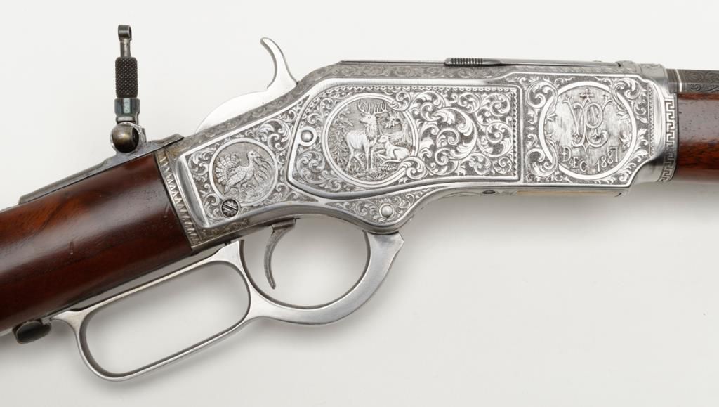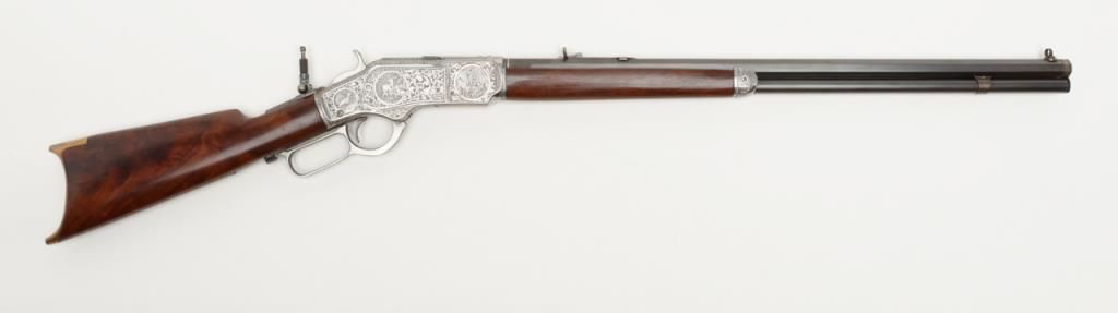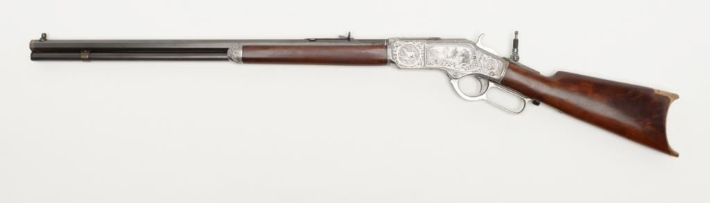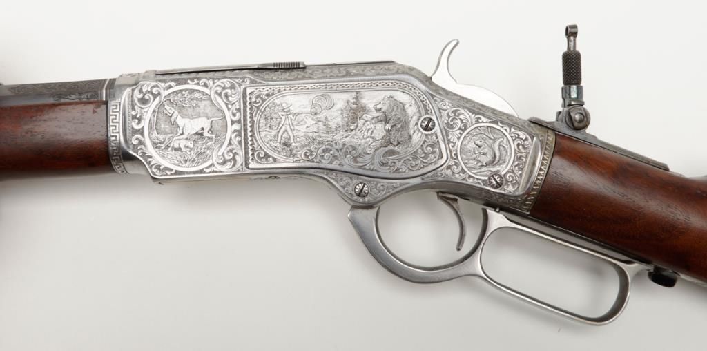 Custom high relief panel scene engraved Winchester Model 1873 lever action rifle, .22 short cal., 24” octagon barrel, blue finish to barrel and loading tube, brass butt plate, wood butt stock and forend, Lyman adjustable tang sight, flip-upbead front sight, standard Winchester rear sight, #199575B. This gun is in overall very good to fine condition as expertly customized and beautifully engraved in the classic Germanic 19th century intertwined scroll style similar to the work ofL.D. Nimschke displaying no less than 6 panel scenes of game including a hunter shooting a bear on the receiver sideplate, plus a fancy additional high relief panel on the front right side of the receiver with ornate initials “WP” and the date“Dec 1887”; the breech of the barrel is also engraved as is the forend cap, the barrel breech single silver banded and the barrel muzzle double gold banded; the majority of a quality re-blue remains on the barrel assembly, the markings areclear, the bore fair and the wood very good as re-finished showing beautiful flame graining to the butt stock. A stunning work of firearm artistry that would be hard to replicate today at anywhere near our estimate assuming you’d be