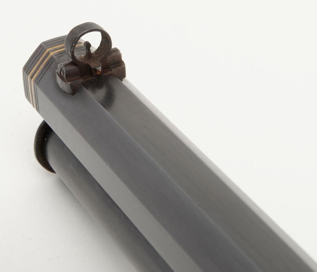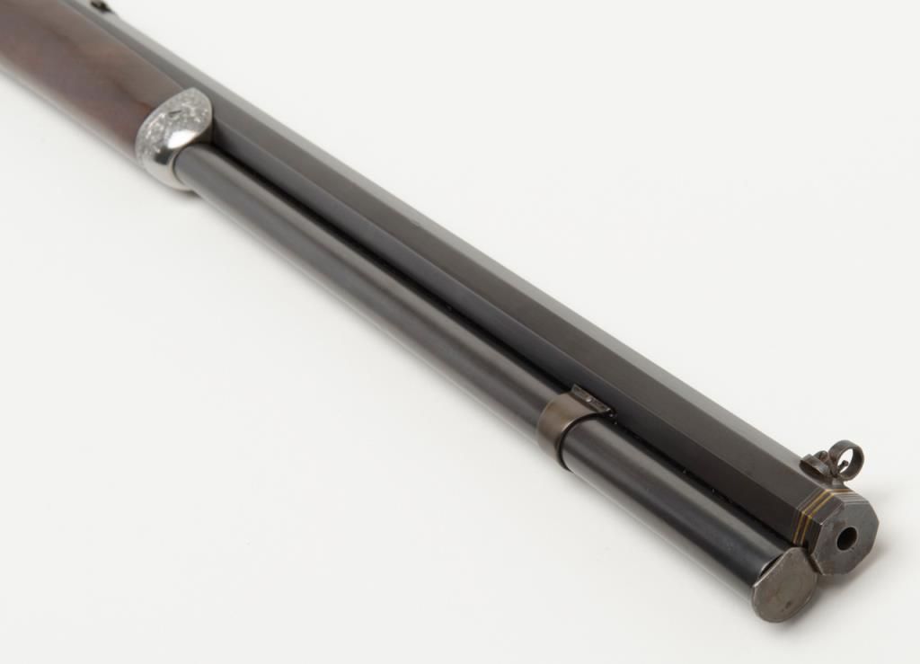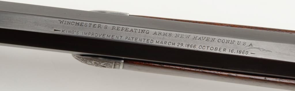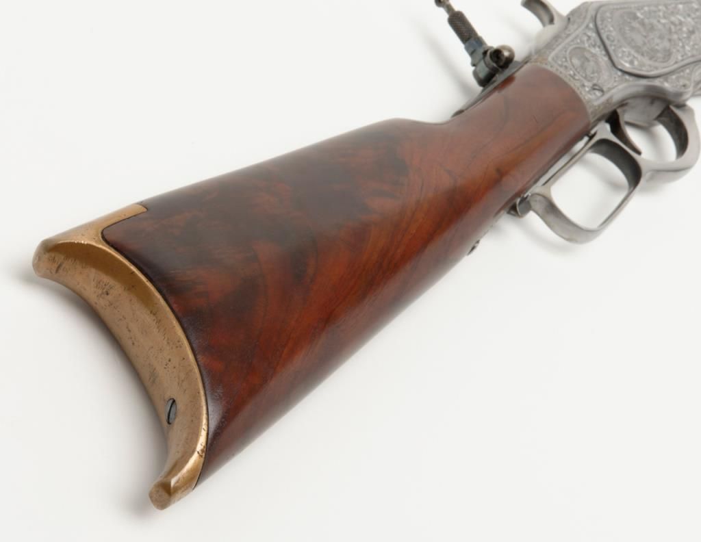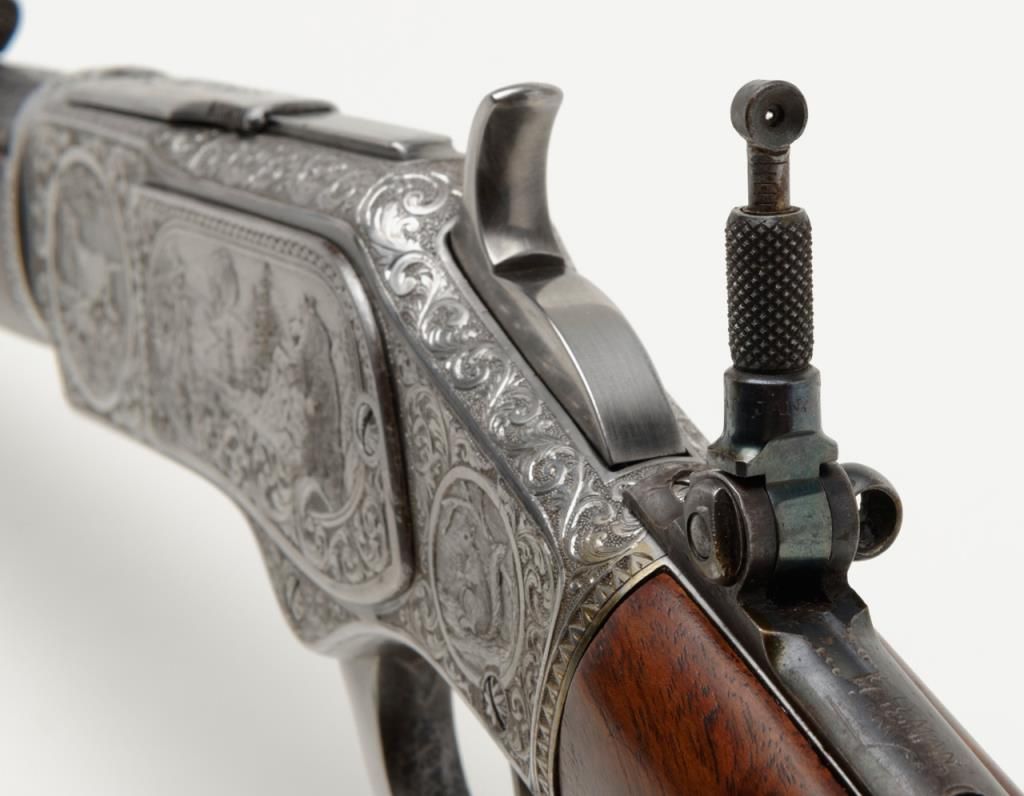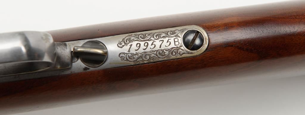 Custom high relief panel scene engraved Winchester Model 1873 lever action rifle, .22 short cal., 24” octagon barrel, blue finish to barrel and loading tube, brass butt plate, wood butt stock and forend, Lyman adjustable tang sight, flip-upbead front sight, standard Winchester rear sight, #199575B. This gun is in overall very good to fine condition as expertly customized and beautifully engraved in the classic Germanic 19th century intertwined scroll style similar to the work ofL.D. Nimschke displaying no less than 6 panel scenes of game including a hunter shooting a bear on the receiver sideplate, plus a fancy additional high relief panel on the front right side of the receiver with ornate initials “WP” and the date“Dec 1887”; the breech of the barrel is also engraved as is the forend cap, the barrel breech single silver banded and the barrel muzzle double gold banded; the majority of a quality re-blue remains on the barrel assembly, the markings areclear, the bore fair and the wood very good as re-finished showing beautiful flame graining to the butt stock. A stunning work of firearm artistry that would be hard to replicate today at anywhere near our estimate assuming you’d be