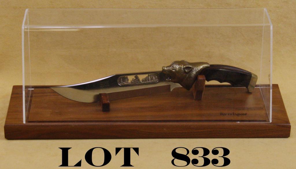 Custom limited edition (3579/5000) large clip point bowie knife by Kershaw approx. 14” overall with an approx. 8” blade in excellent condition showing little handling and accompanied by a custom Kershaw display case; the finger groove wood grip is excellent, the brass pommel simple in design and the cross guard area displays a cast brass bear head; a cut out at the rear top portion of the blade is inset with a seated bear in thewoods. A great display piece from a well-known modern maker. Est.: $250-$500.