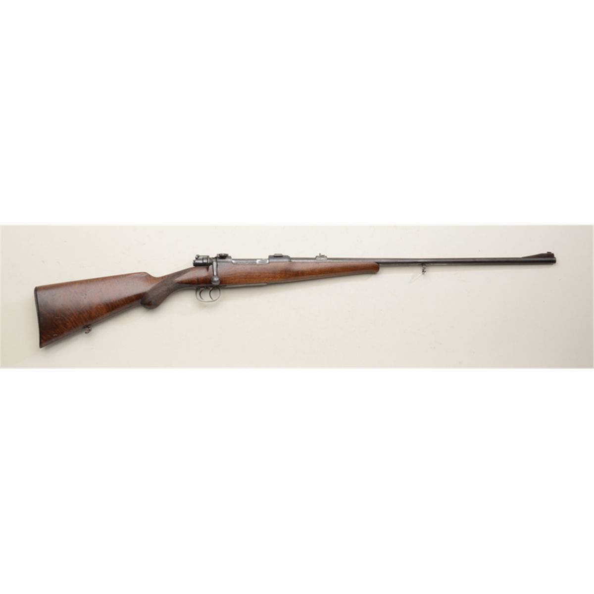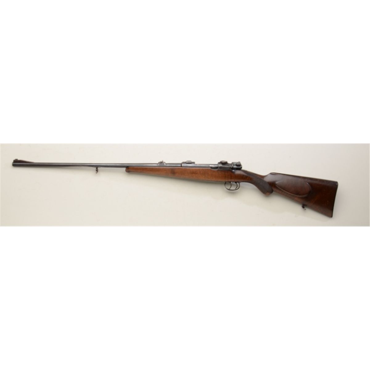 Custom-made Willi Karl bolt-action sporting rifle, 8 x 57mm cal., 24” round barrel, blue finish, checkered wood half stock, sling swivels, double set triggers, claw scope mounts, #457. This gun is in overall verygood + condition showing traces of blue finish mixed with a pleasing brown patina on metal surfaces, very good to fine bore, crisp action, sharp markings, very good wood showing some scattered old mars and scratches from storage. A really classic German custom sporting rifle. Est.: $400-$800.