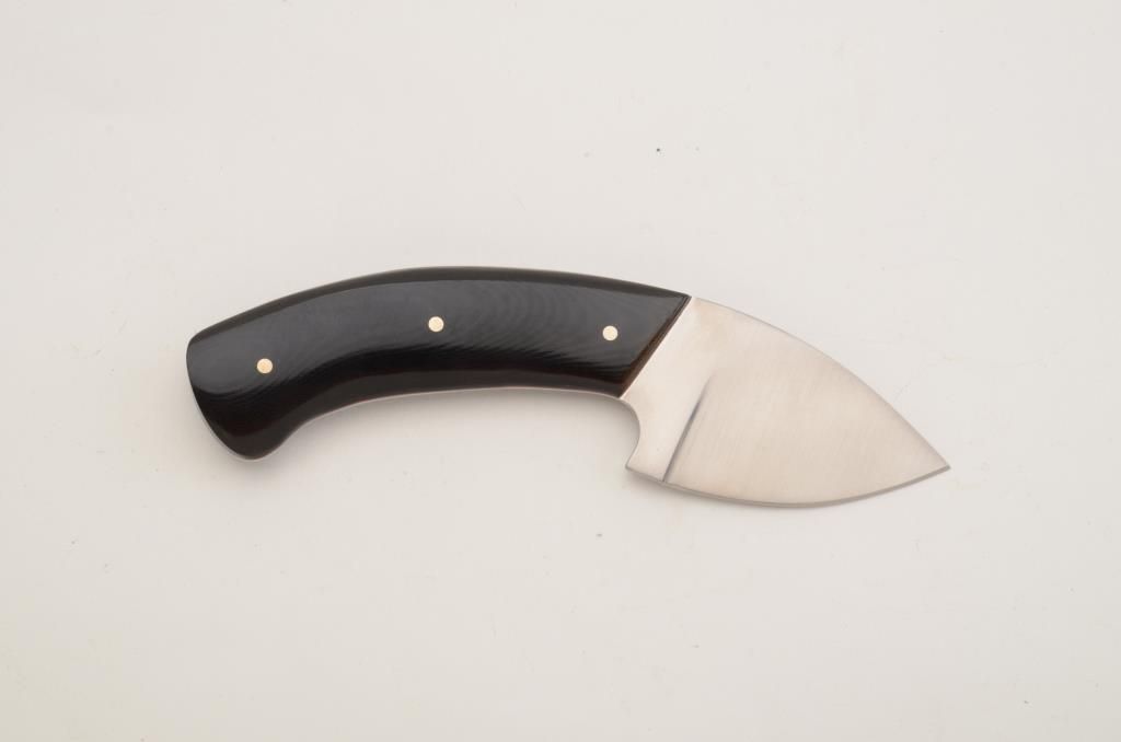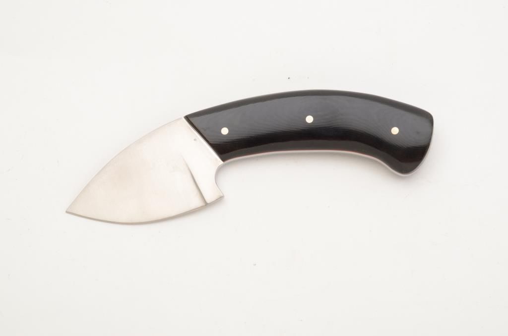 Custom-made skinning knife in like new condition showing little handling, approx. 7” overall with a broad 3” blade, three pinned curved grip; beautifully made although unmarked by maker. Est.: $50-$75.