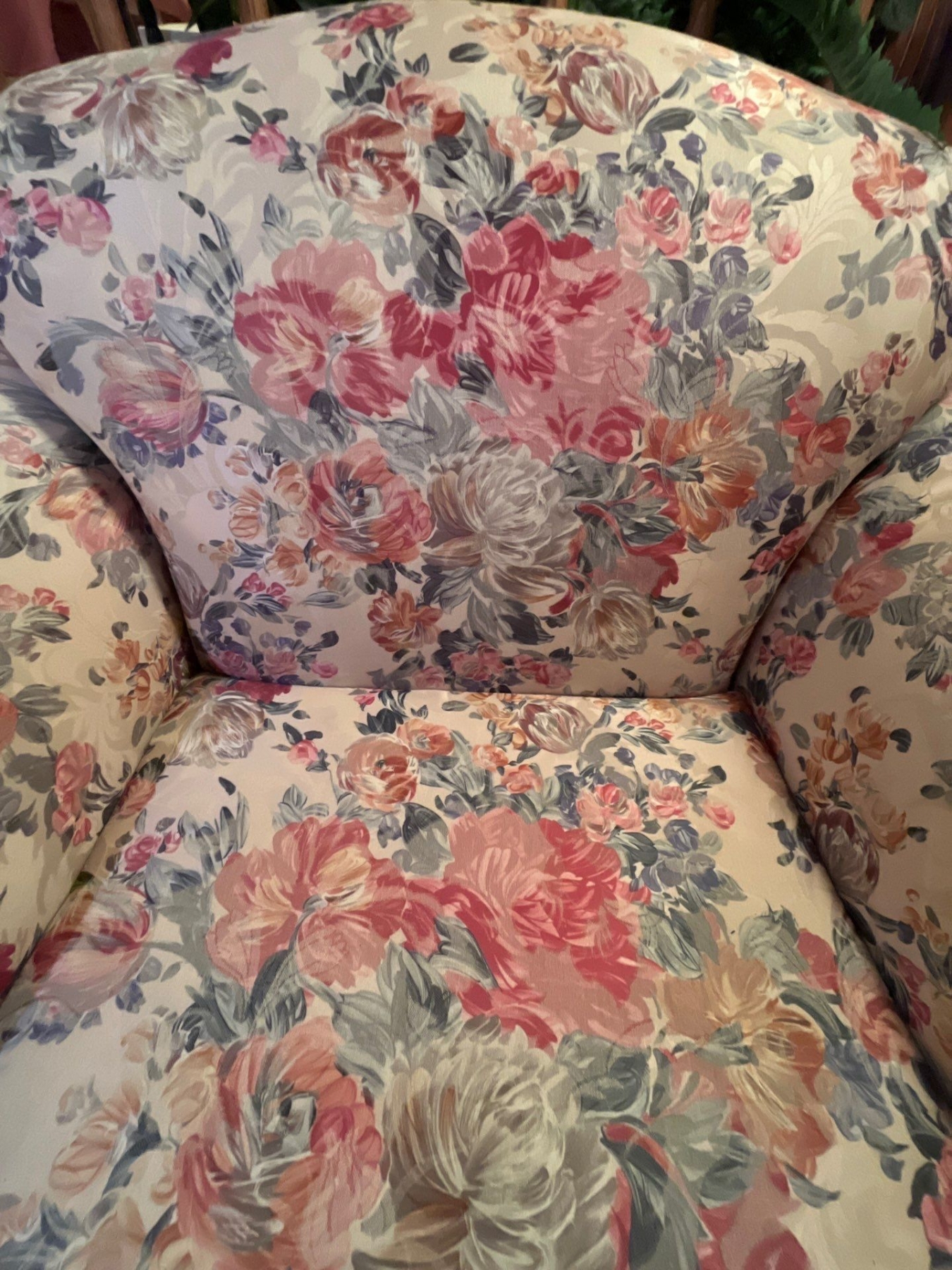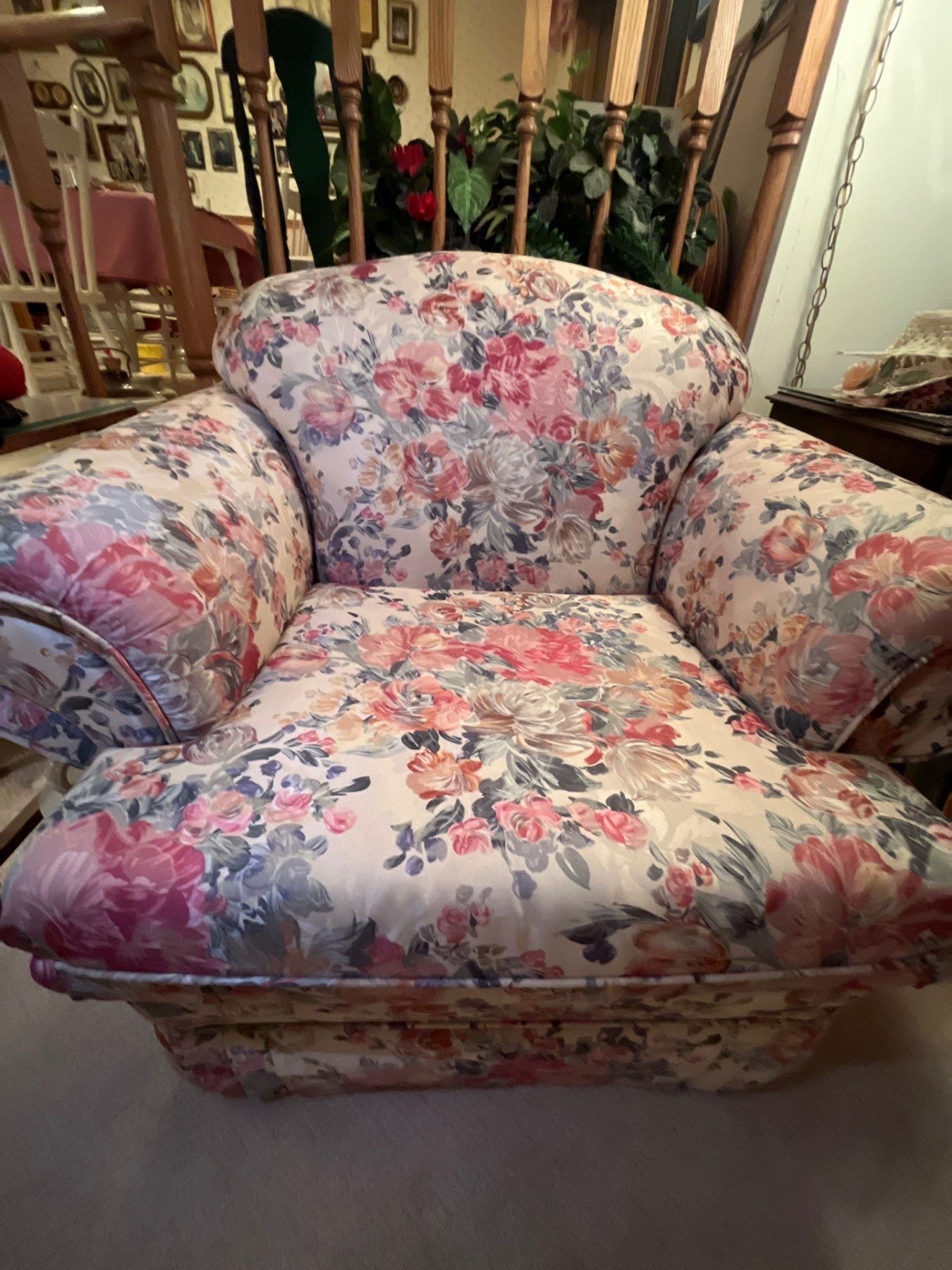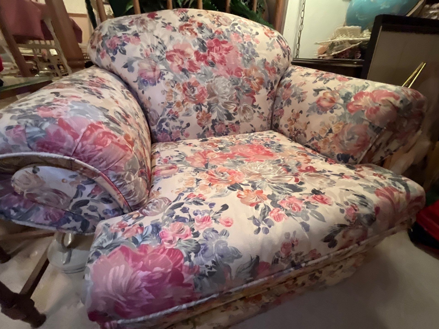 Custom made solid wood frame floral print vintage couch and chair in like new condition very comfortable
