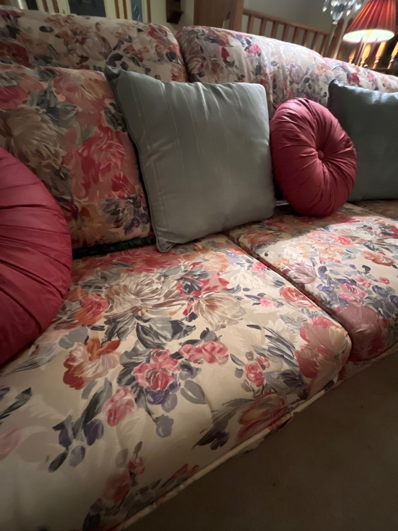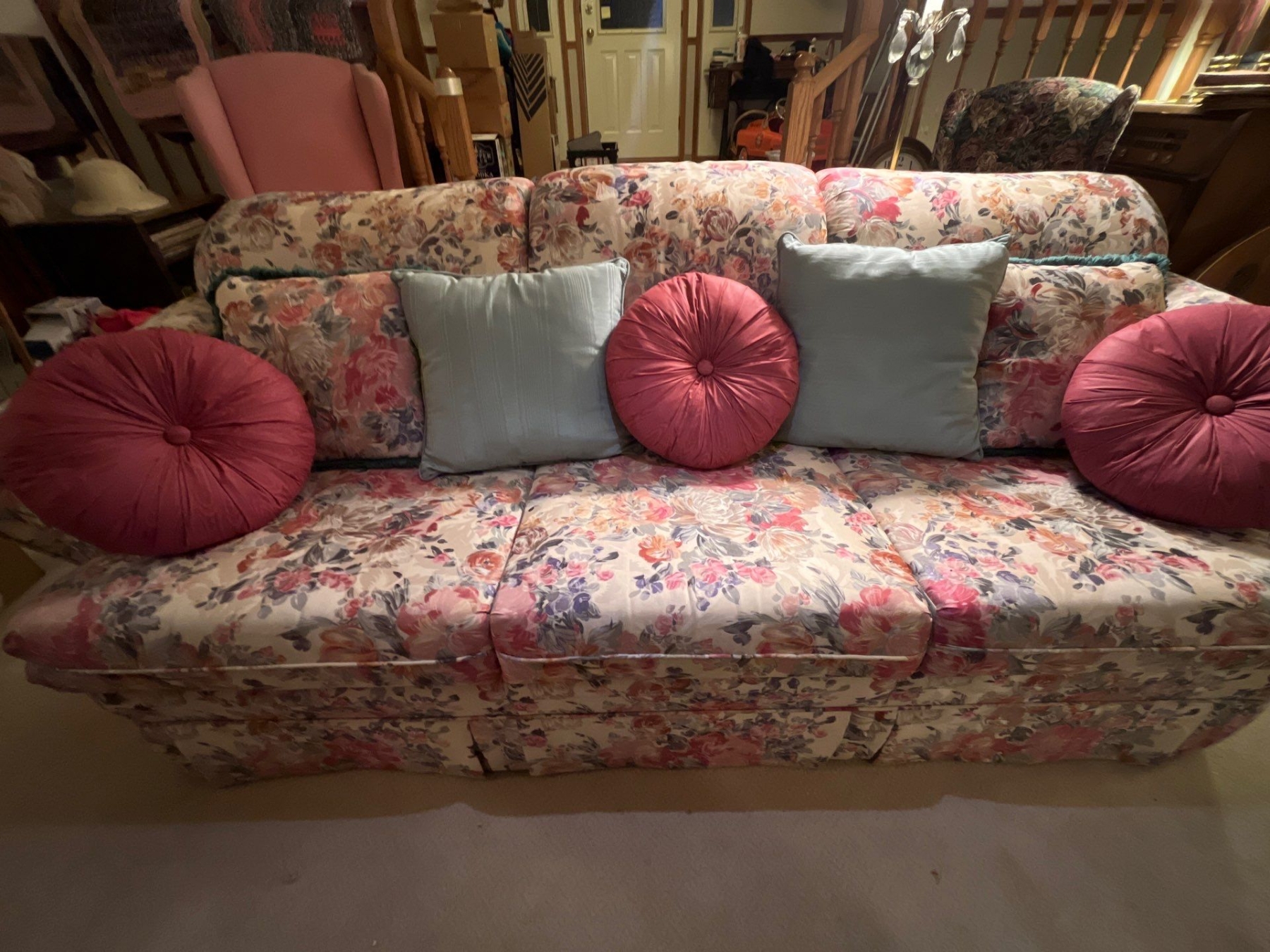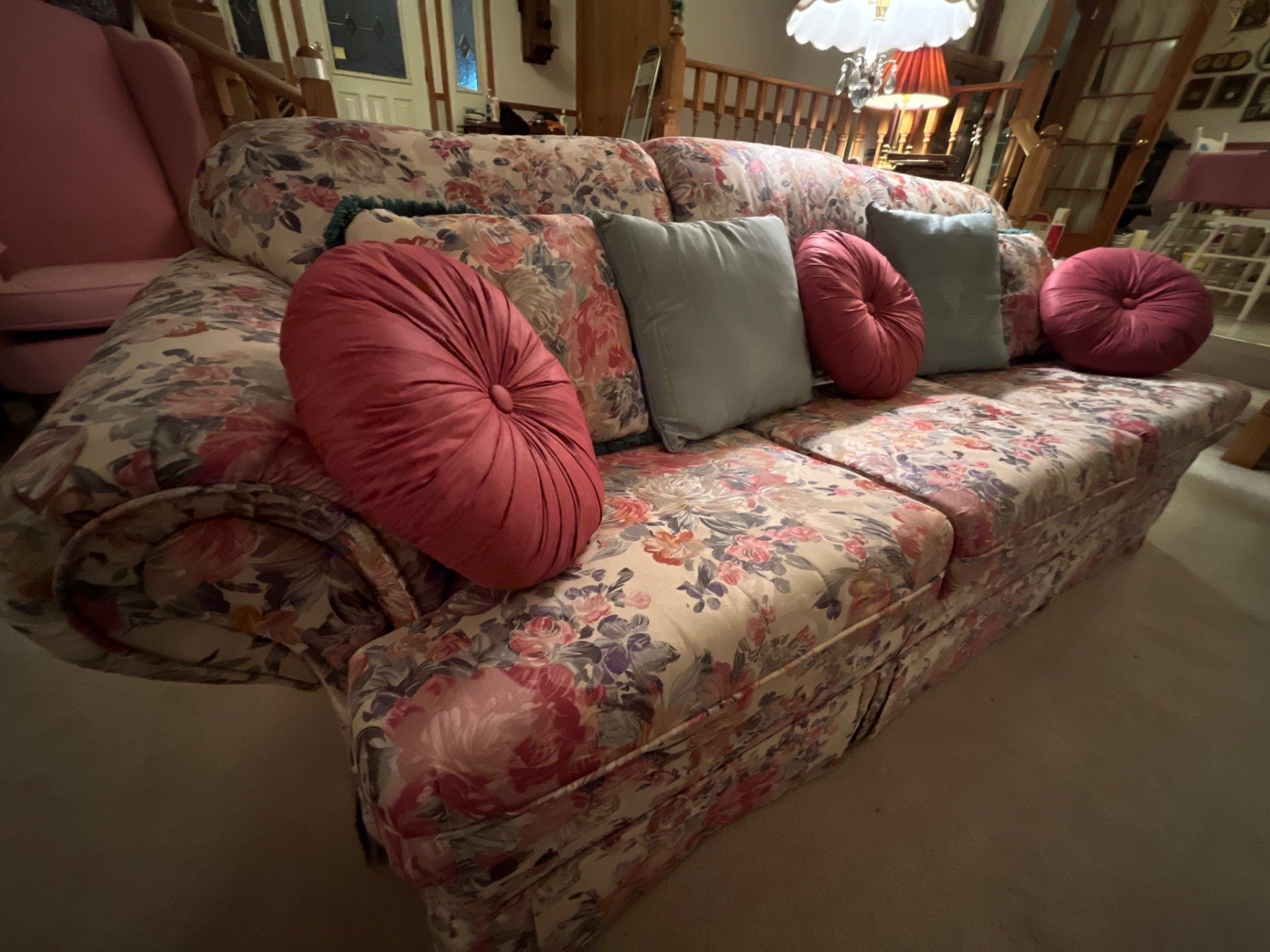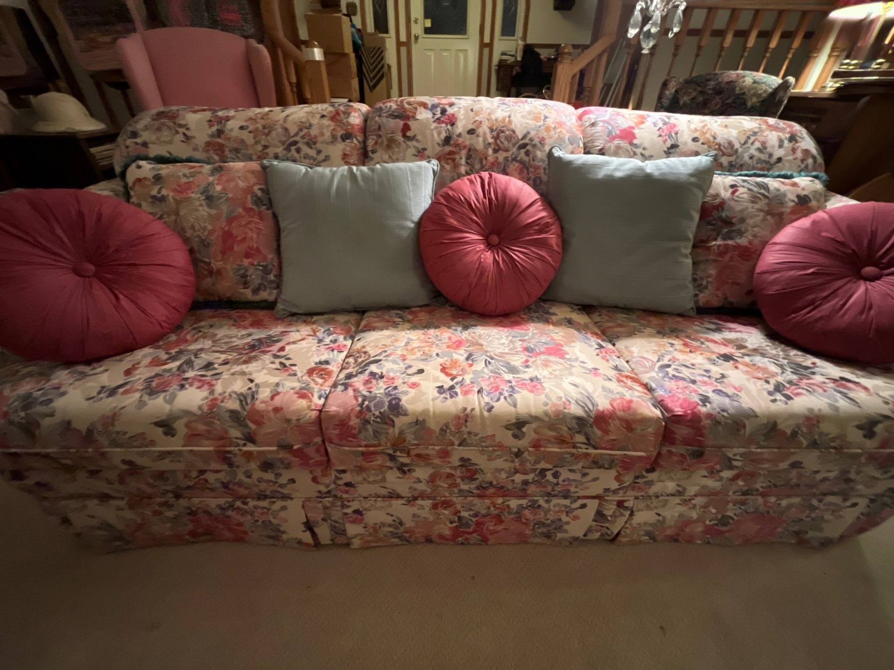 Custom made solid wood frame floral print vintage couch and chair in like new condition very comfortable