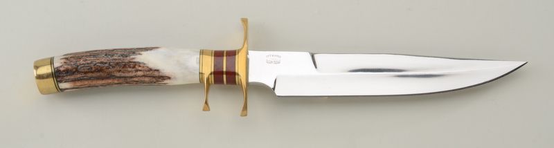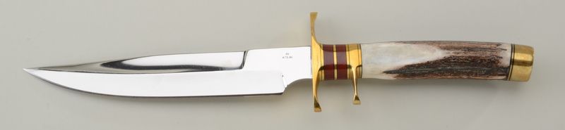 Custom modern knife by Ott Knives, Elgin, TX approx. 14-1/2” overall with an approx. 8” blade, double brass guard, brass pommel, stag grip with stacked exotic wood and brass fitting between the guards; like newcondition. Est.: $400-$800.