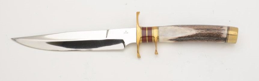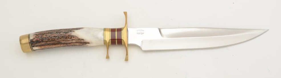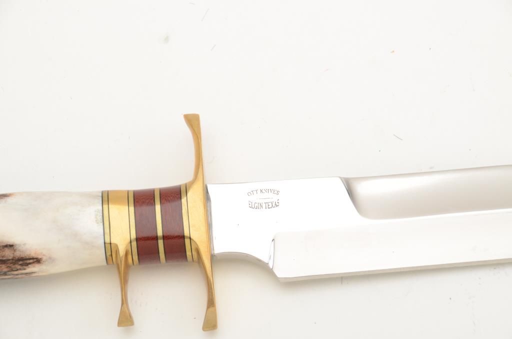 Custom modern knife by Ott Knives, Elgin, TX approx. 14-1/2” overall with an approx. 8” blade, double brass guard, brass pommel, stag grip with stacked exotic wood and brass fitting between the guards; like newcondition. Est.: $400-$800.