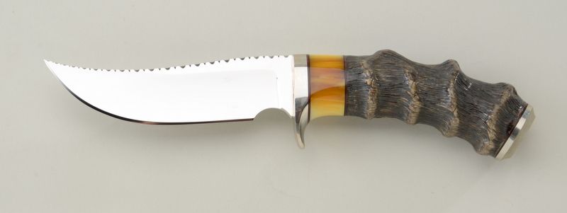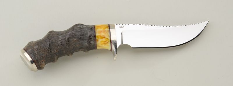Custom modern skinning knife by Kious with fancy finger groove horn grip, approx. 10” overall with an approx. 5” blade in like new condition. Est.: $300-$600.