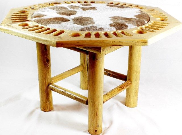 on log base with incorporated ship and drink holders, padded steer hide top. Original purchase price $1500. Excellent condition, top 49" X 49". Est. 600-1200